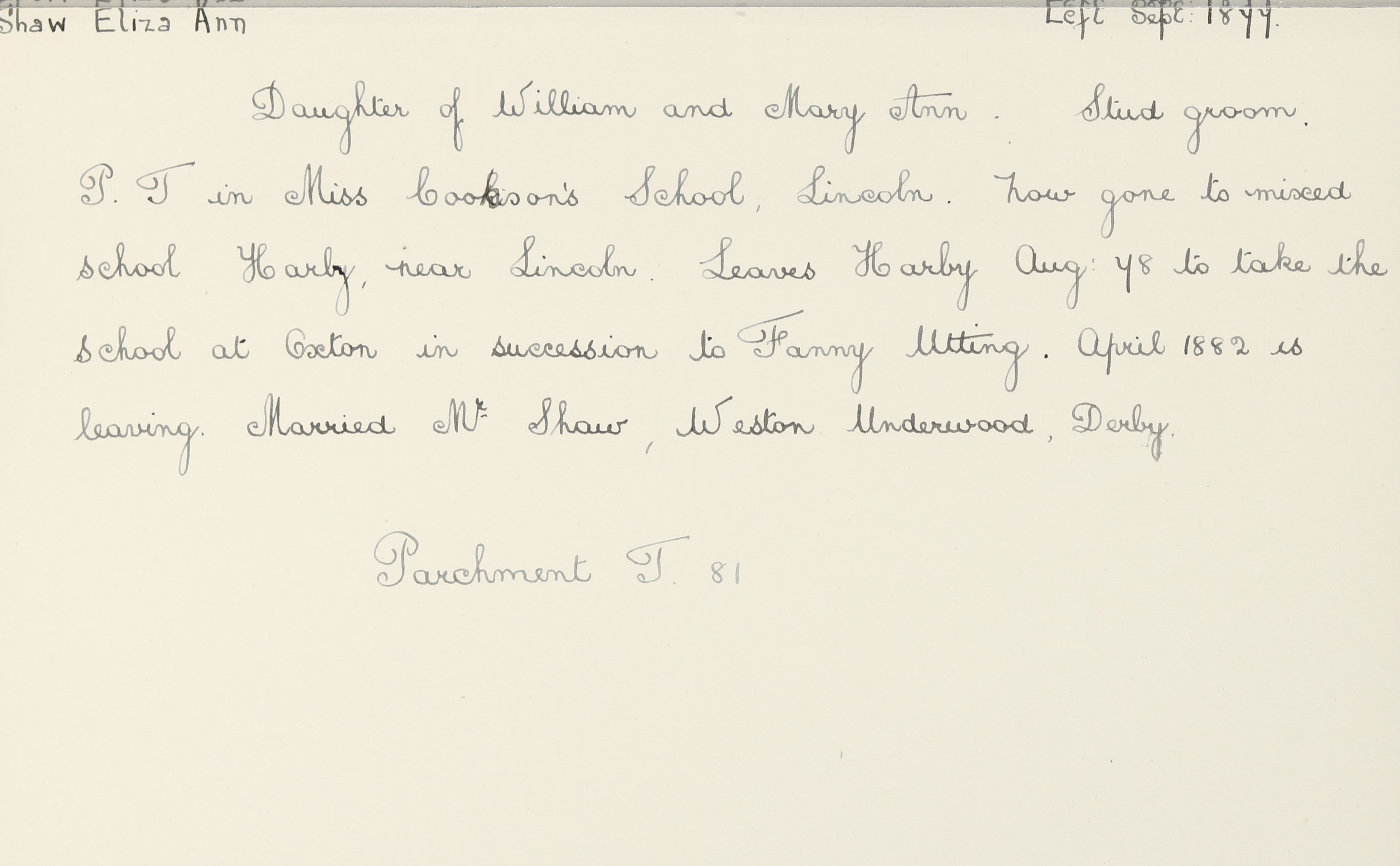 SHAW, Eliza Ann of Weston Underwood, Derbyshire (wife of Herbert Shaw) died 28 July 1913. Probate London 13 February to Caroline Shaw and Annie Maria Shaw, spinsters. Effects £648, 16s, 3d.