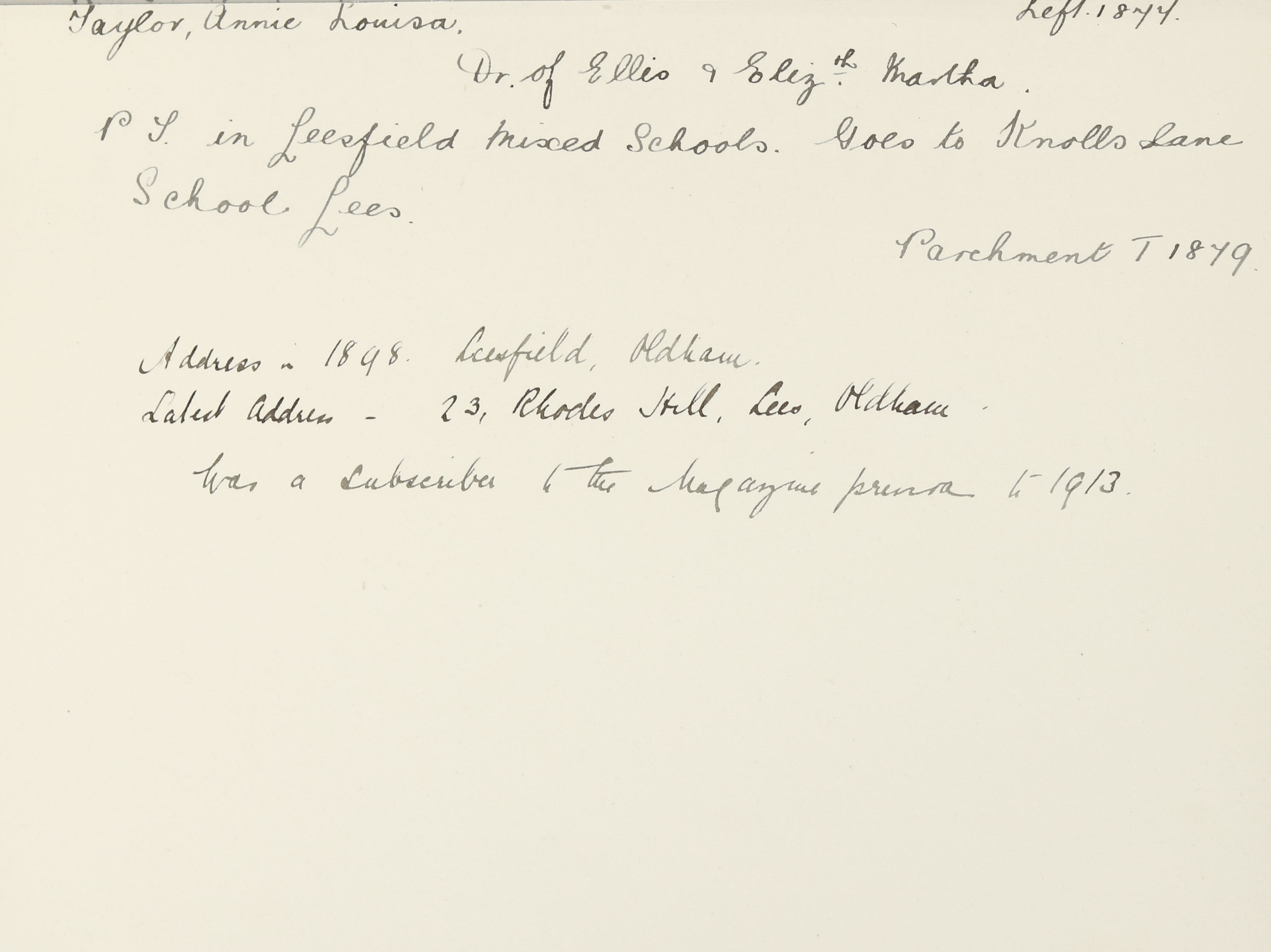 She is at 23 Rhodes Hill, Lees. Annie and her sister, Mary, are listed as ‘Teacher’, Her sister, Martha, is unlisted.