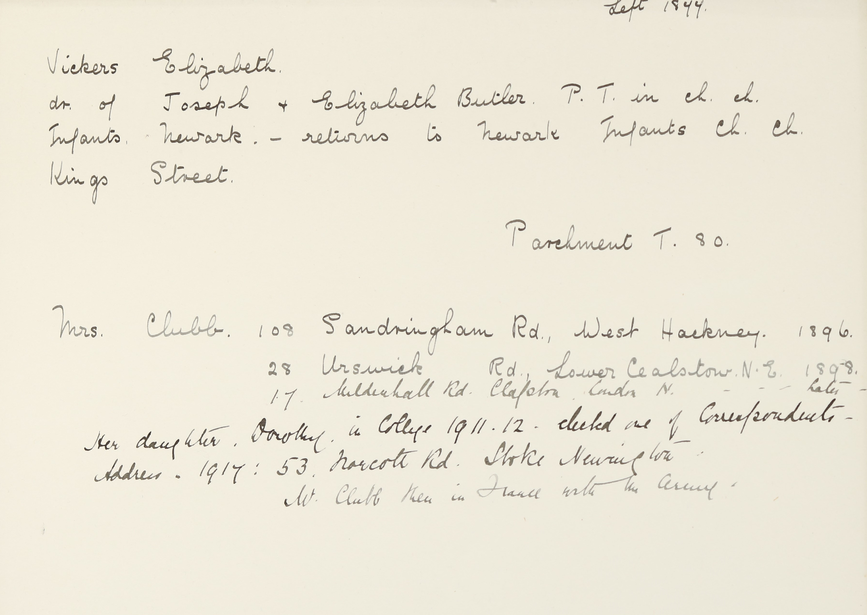 She is at 77 Midenhall Road, Lower Clapton. Her husband is listed as ‘Schoolmaster’. Elizabeth is unlisted. There is a servant, Ada Smith (b. 1894).