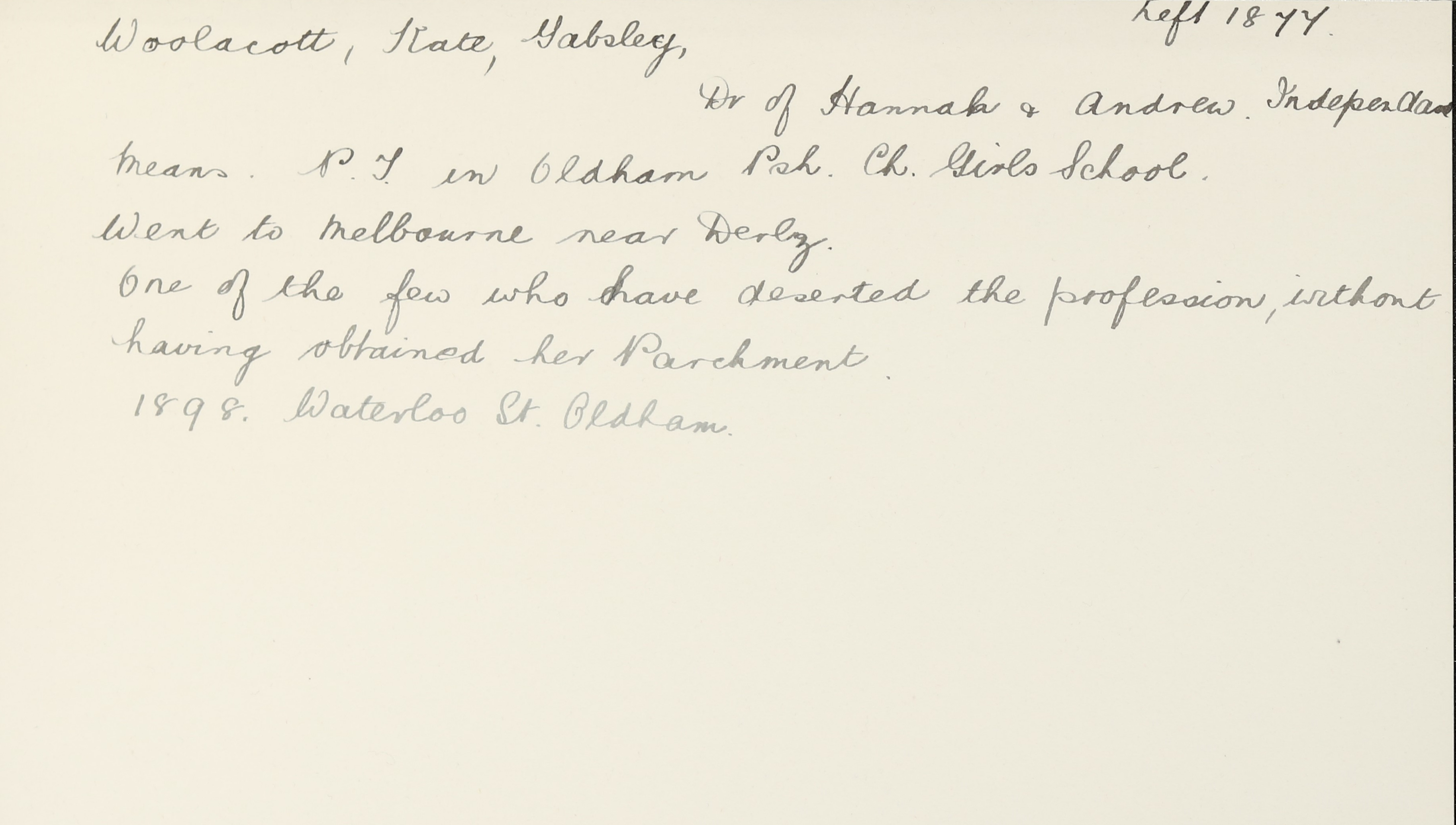 She is at 8 Waterloo Street, Oldham. Her mother is an unlisted widow. Her sister, Hannah, and niece, Lilian H Woollacott (b. 1880), are unlisted. Kate and her sister, Ellen, are listed as ‘Teacher’.