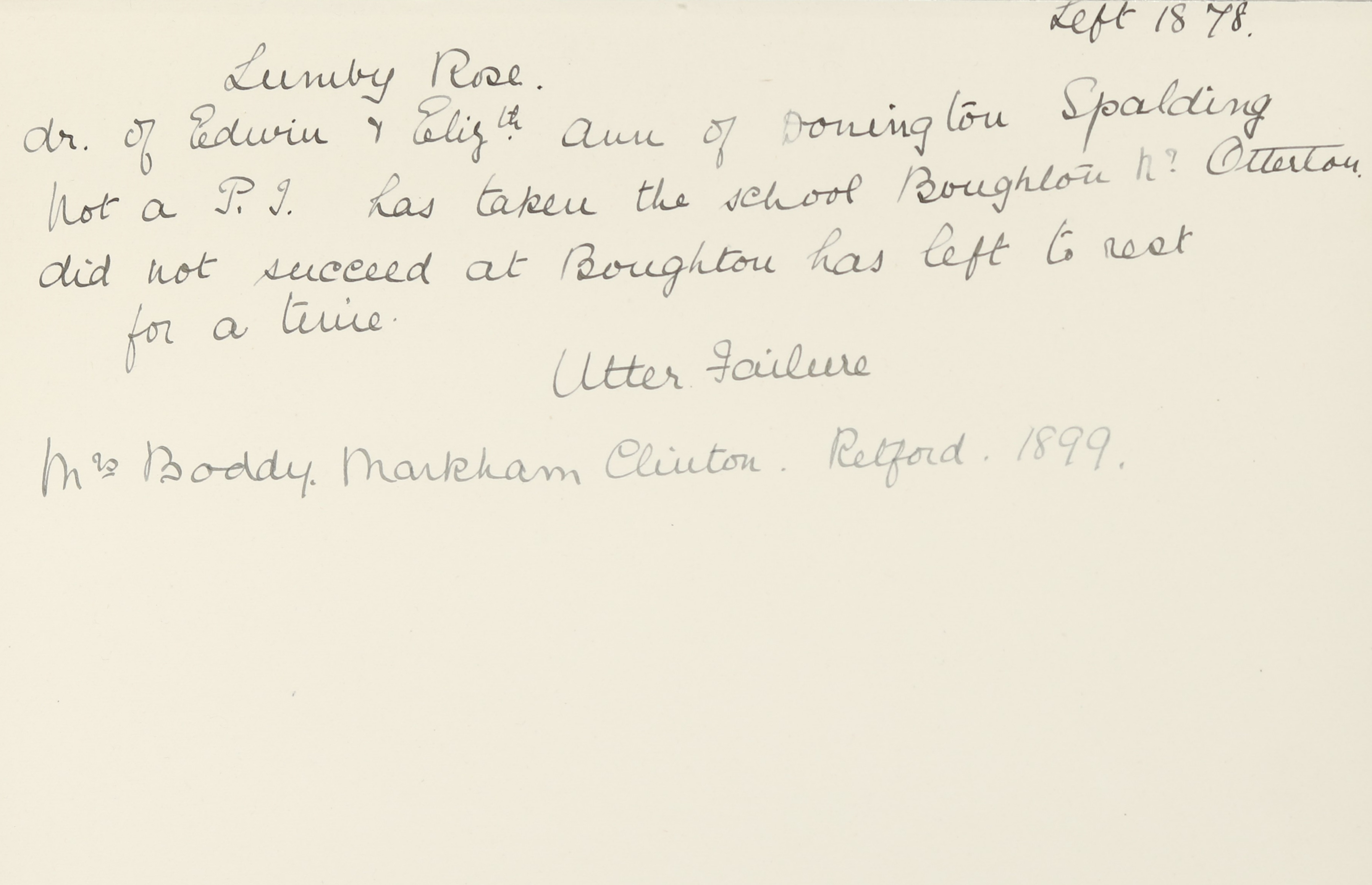 She is at Spalding Road, Donington.Her father is listed as ‘Auctioneer and Farmer’. Rose, her mother and siblings (Frederick, Frank, Herbert, Lucas, Ann and Edith) are unlisted. Mary Lode (b. 1845), is a servant and ‘Company Keeper’. Richard Hunt (b. 1806) is a visitor and ‘Collector of Taxes’. William Taylor (b. 1853) is a servant ‘Groom’. There is another servant, Sarah Millhouse (b. 1855).