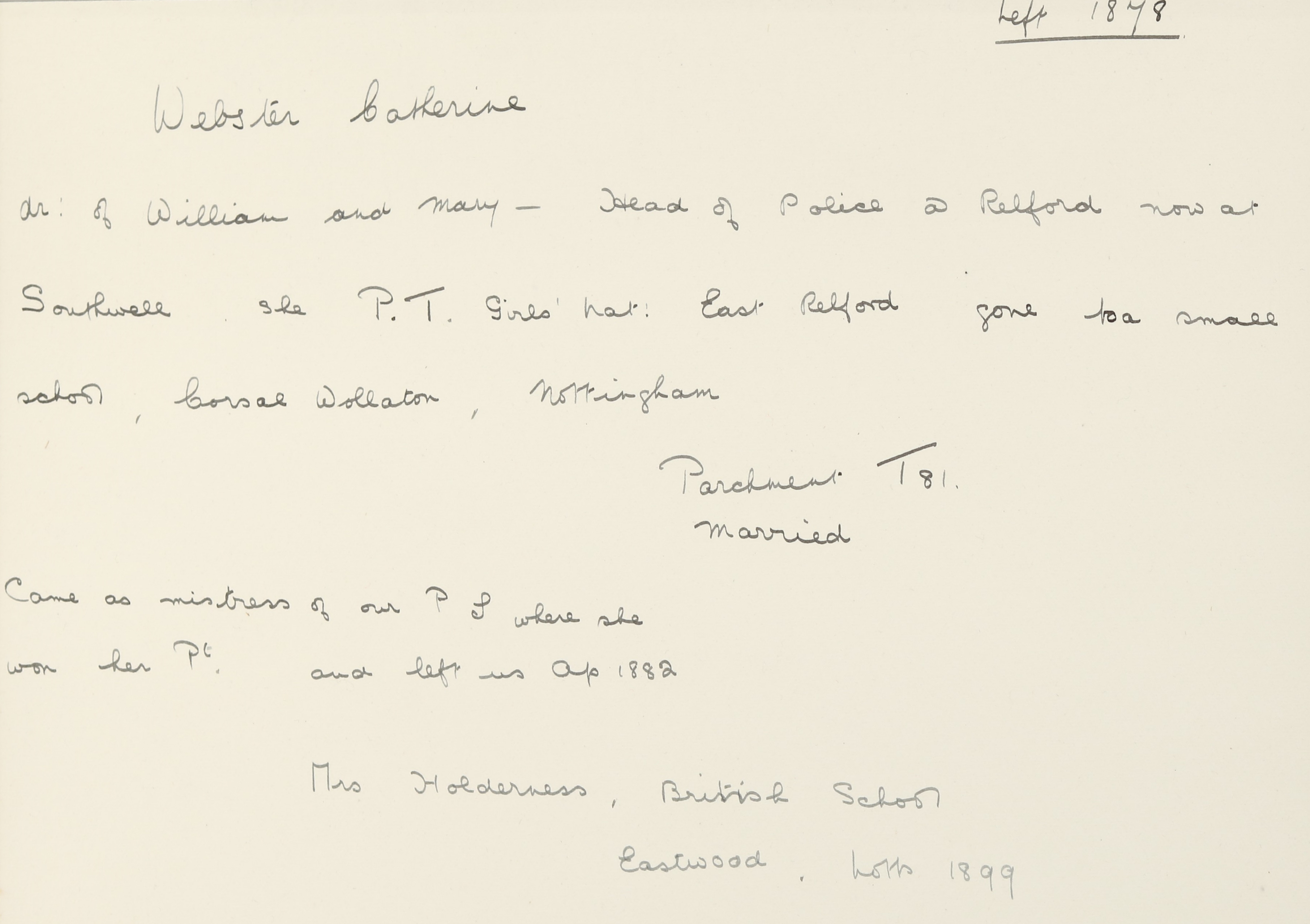 She is at Church Street, Eastwood. Her husband is listed as ‘Schoolmaster’. Catherine is listed as ‘Schoolmistress’. Her daughters, Ellen, Catherine, Dorothy and Elsie, are unlisted. There is a servant, Hannah Saxton (b. 1872).
