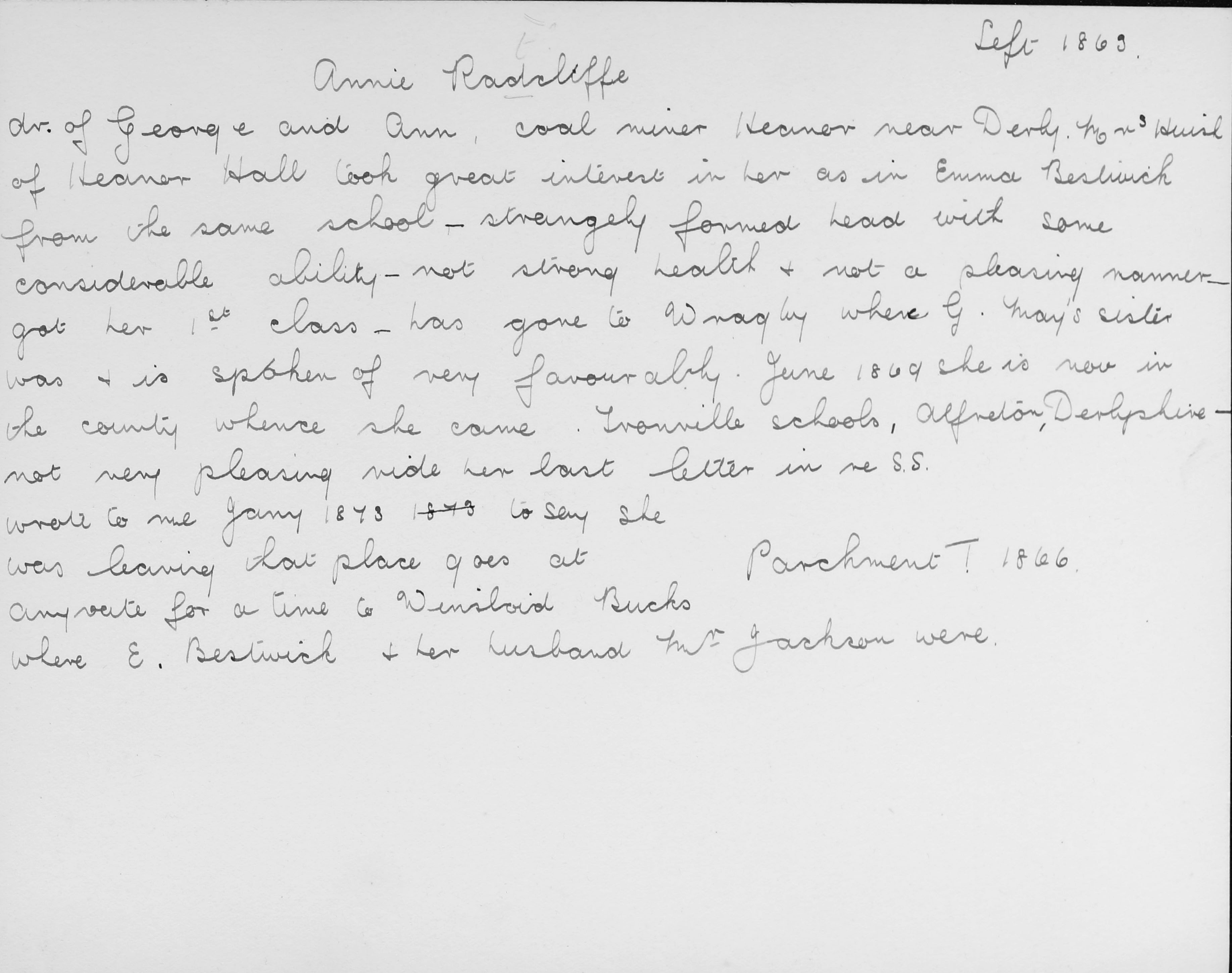 RATCLIFFE Annie Rebecca, Personal Estate £189 15s. 10d. Administration of the Personal Estate of Annie Rebecca Ratcliffe late of the Board School House, Willington near the Town of Bedford in the County of Bedford. Spinster, who died 19 May 1889 at the Board School House was granted at the Principal Registry to George Ratcliffe at Audensahw Road, Audenshaw, Aston-under-Lyne in the County of Lancaster, Colliery Agent, the Brother and one of the Next of Kin.