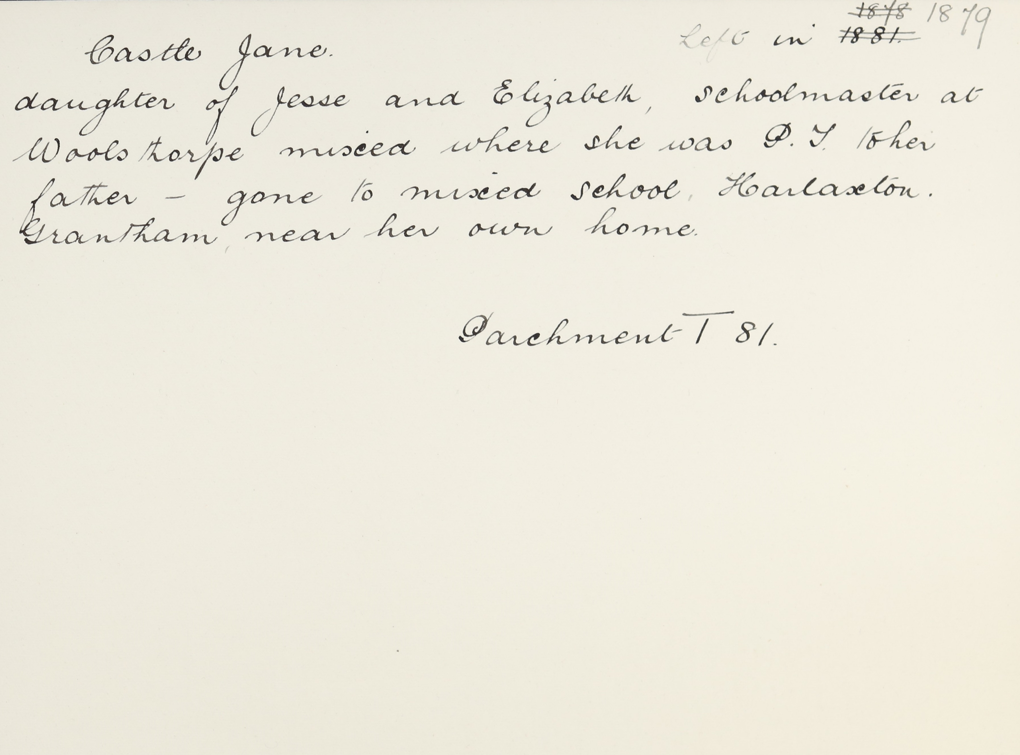 She is at Knipton, Grantham. Her father is listed as ‘Certificated Schoolmaster’. Her mother is listed as ‘School Needlewoman ½ Day’. Jane and her siblings (Caroline, Alice, Arthur and Charles) are unlisted. There is a boarder, George Hall (b. 1845), a ‘Pupil Teacher’.