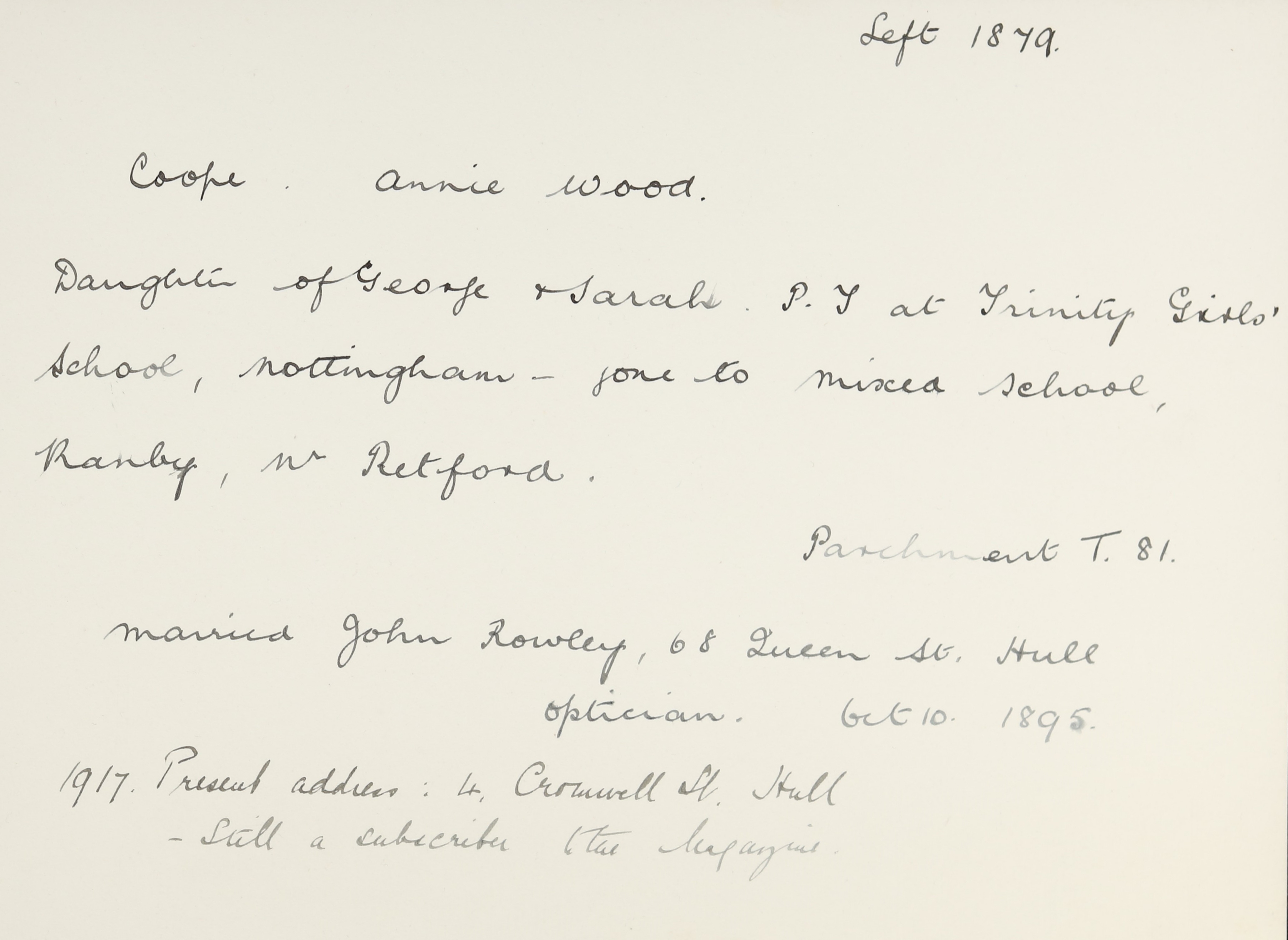 Marries John Rowley 10.10.95. Add: 68 Queen Street, Hull.