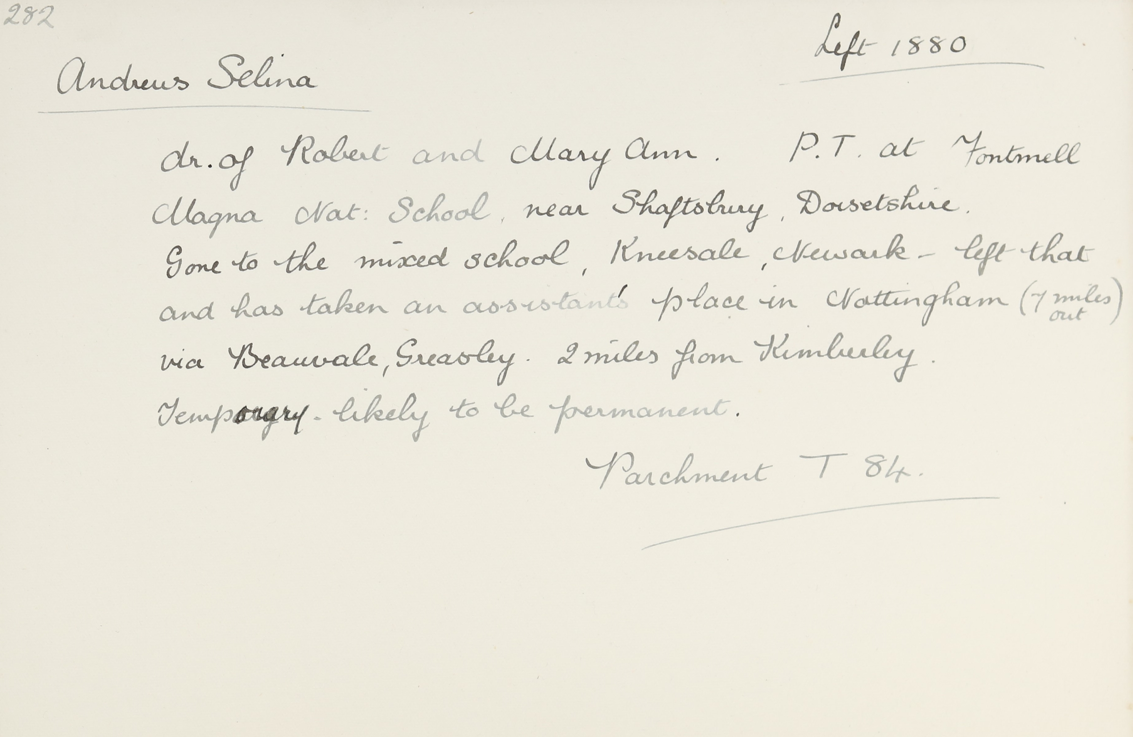 She is at Kneesal, Nottinghamshire. Selina is listed as ‘Schoolmistress’. Her sister, Amelia, is listed as ‘Housekeeper’.