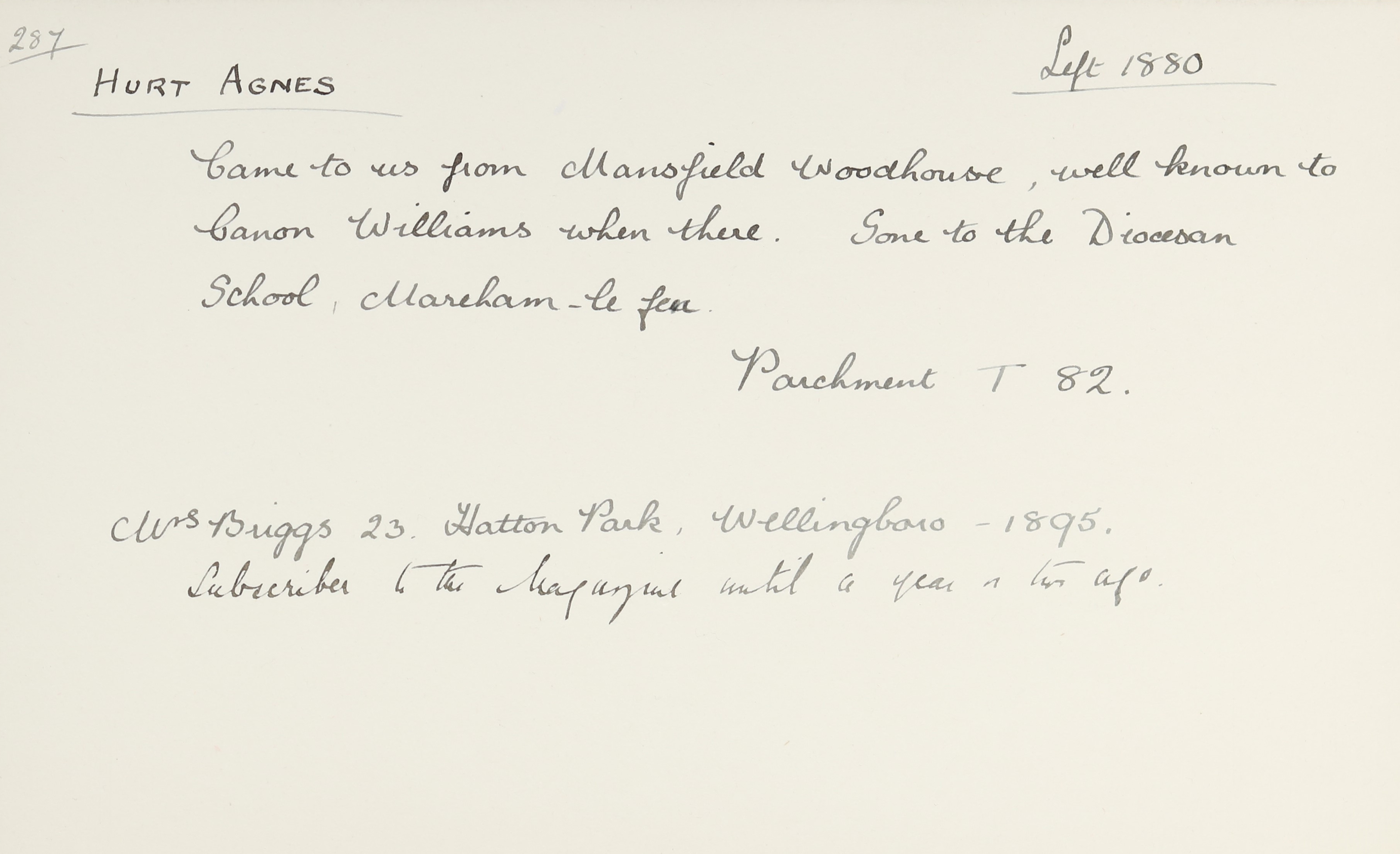 She is at School Lane, Mareham-Le-Fen, Horncastle. Agnes is listed as ‘School Mistress’. Jane Grenfell (b. 1857) is listed as ‘Companion’ and ‘House Keeper’.