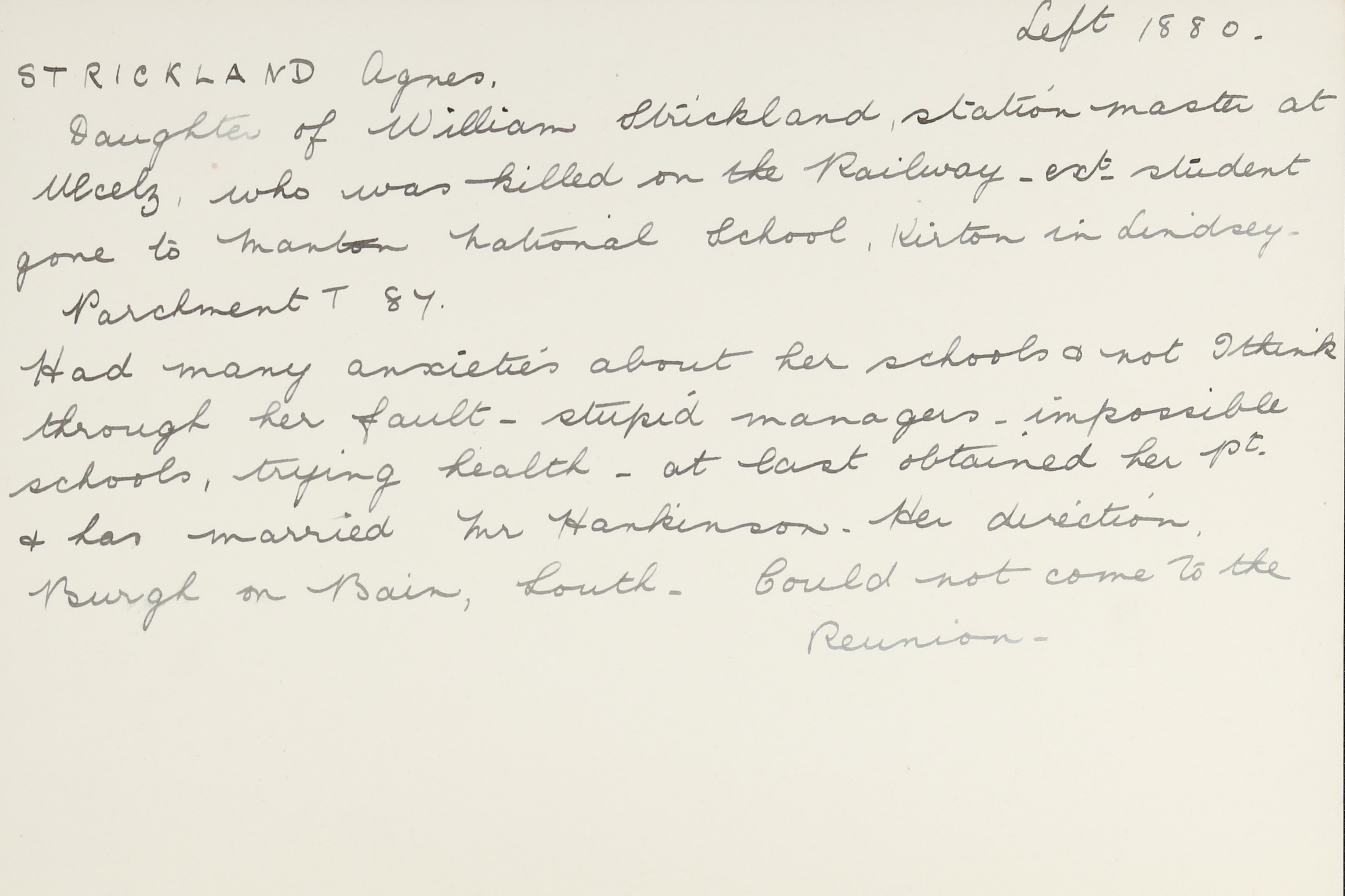 She is at Town Street, South Leverton. Her father is listed as ‘Stationmaster Railway’. Agnes, her mother and sister, Eliza, are unlisted.