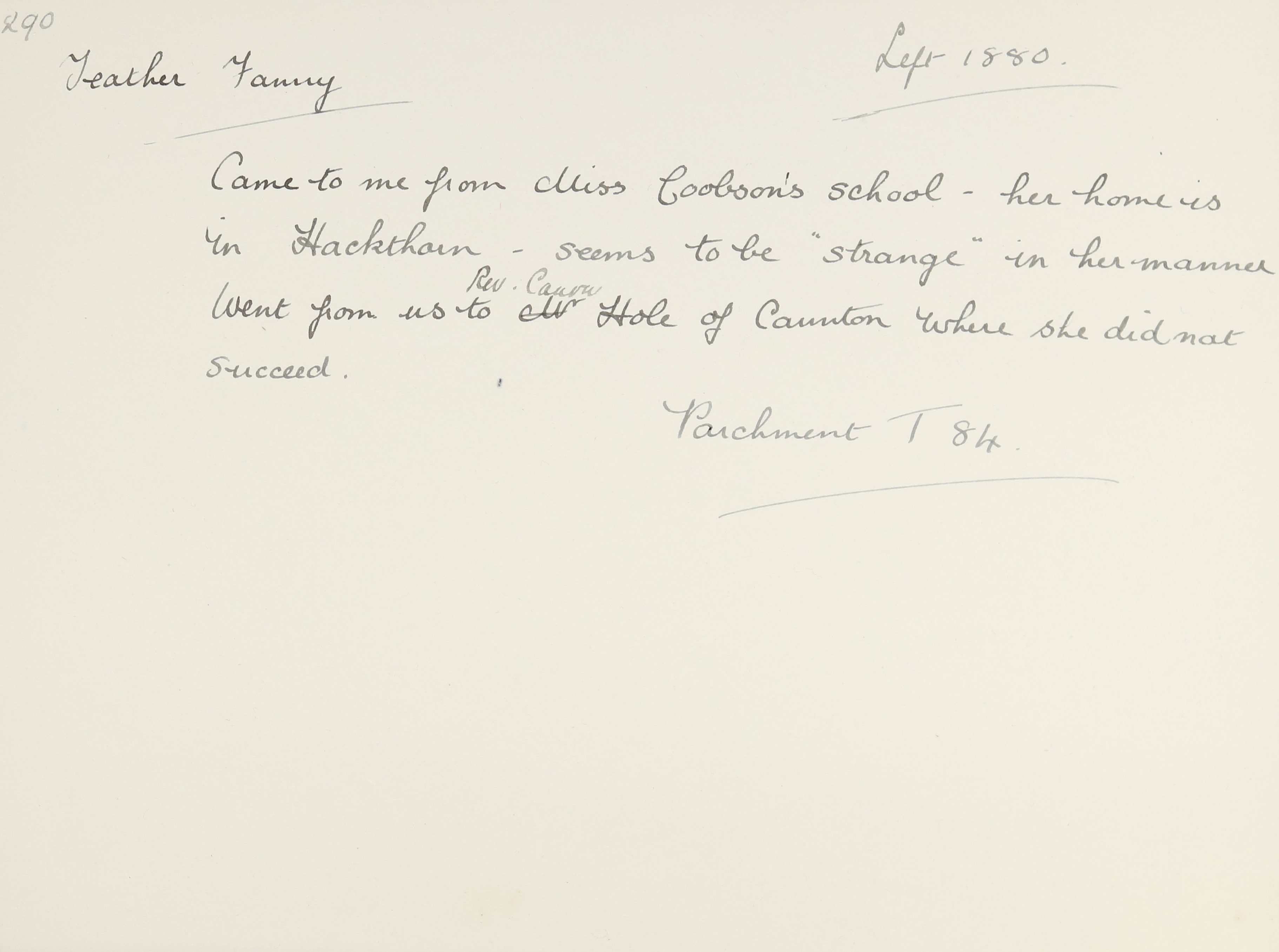 She is at Hackthorn, Lincoln. Her father is listed as ‘Wheelwright’. Fanny is listed as ‘Schoolmistress’. Her mother is unlisted.