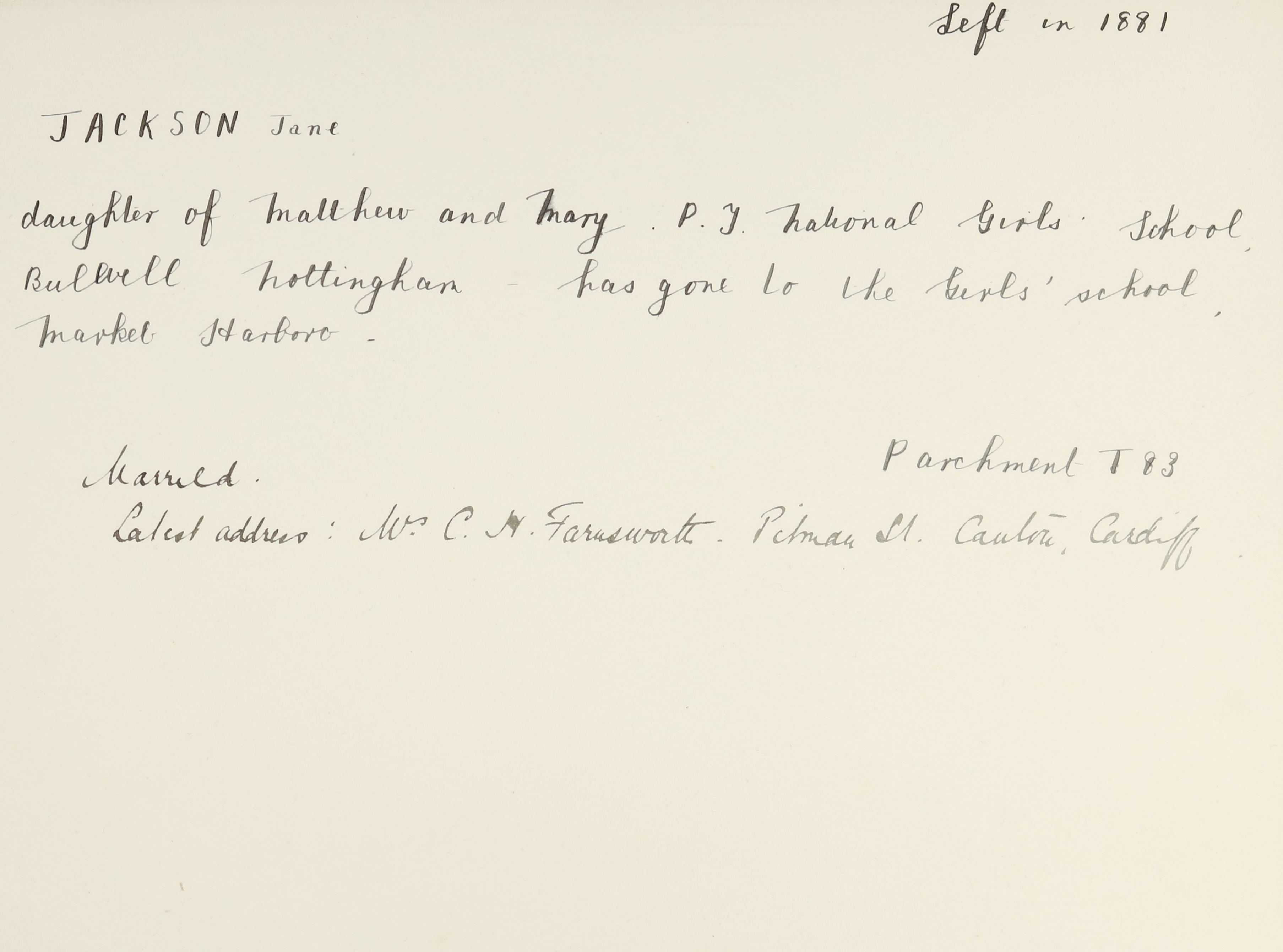 She is at Highbury Road, Bulwell. Her aunt, Hannah Glover (b. 1831), is listed as widower and ‘Retired Grocer’. Jane and her sister, Annie, are listed as ‘Tuition’.