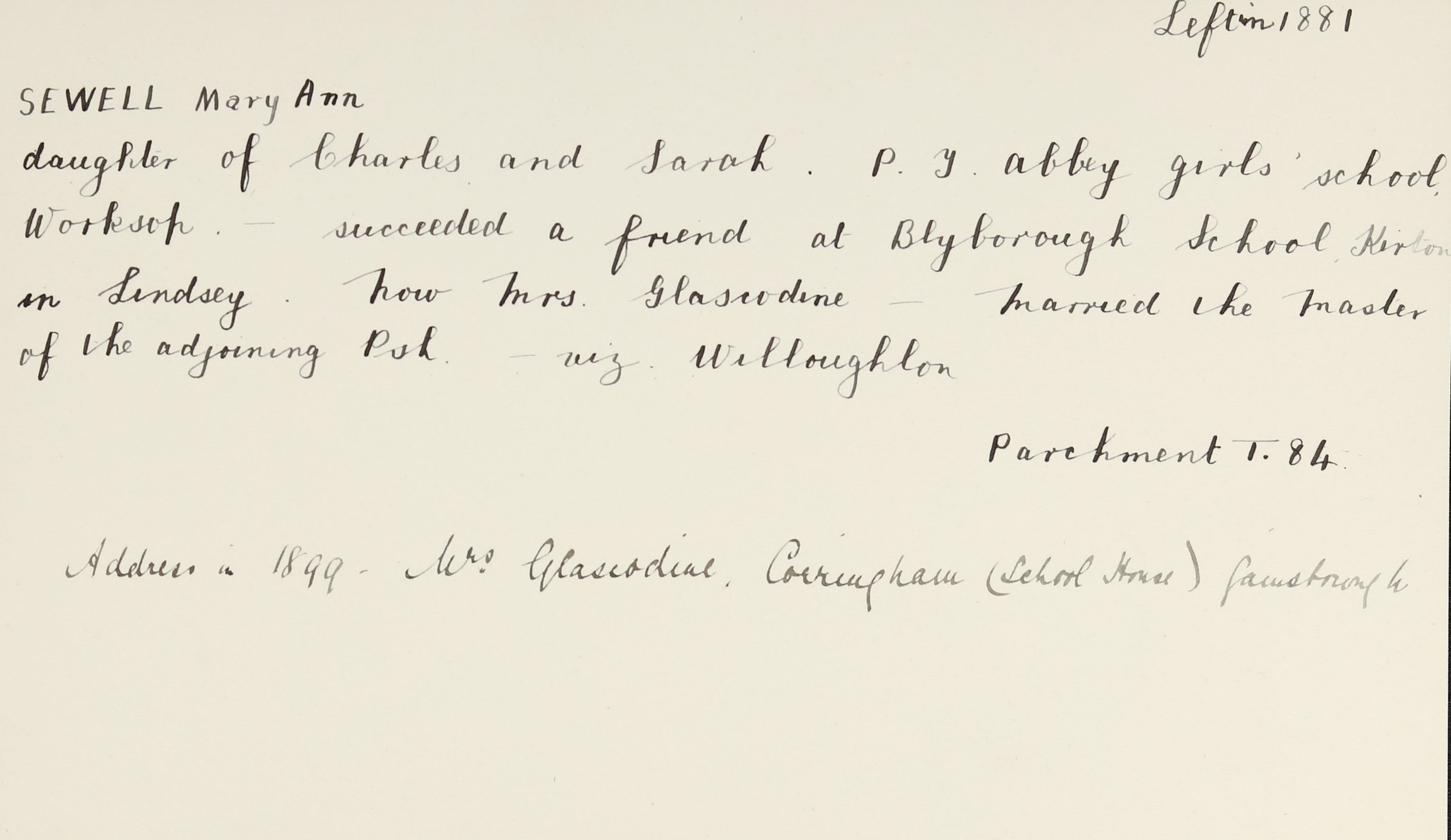 She is at East Gate Court, Worksop. Her father is listed as ‘Carter’. Mary Ann, her mother, her sister, Hannah, and her grandmother, Mary Sewell (b. 1804), are unlisted.
