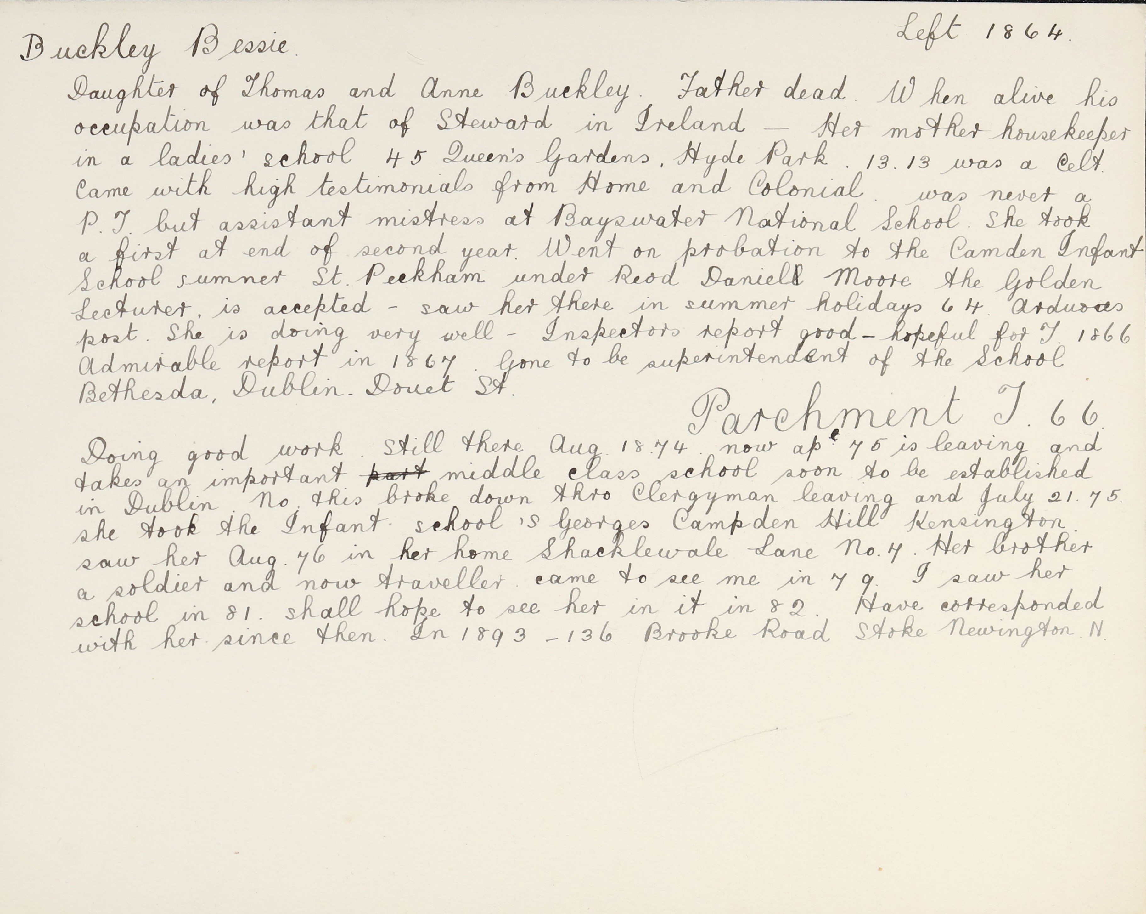 She is at 12 Granville Terrace, Hackney. Her sister-in-law, Anna Buckley (b. 1845) and Bessie’s nieces, Bessie Anna Buckley (b. 1877) and Maud M Buckley (b. 1881), are unlisted. Bessie is listed as ‘Teacher (School)’. There is a visitor, Martha Pope (b. 1821). There is a servant, Bessie Shirley (b. 1856).
