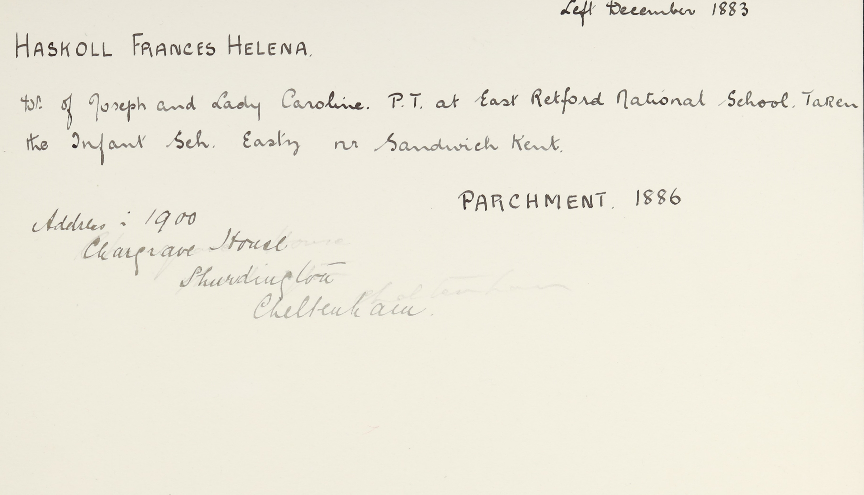 She is at Miss Haskell Schoolmaster Lillipent Cottage, Lilleport, Parkstone, Poole. Frances is listed as ‘Teacher’.