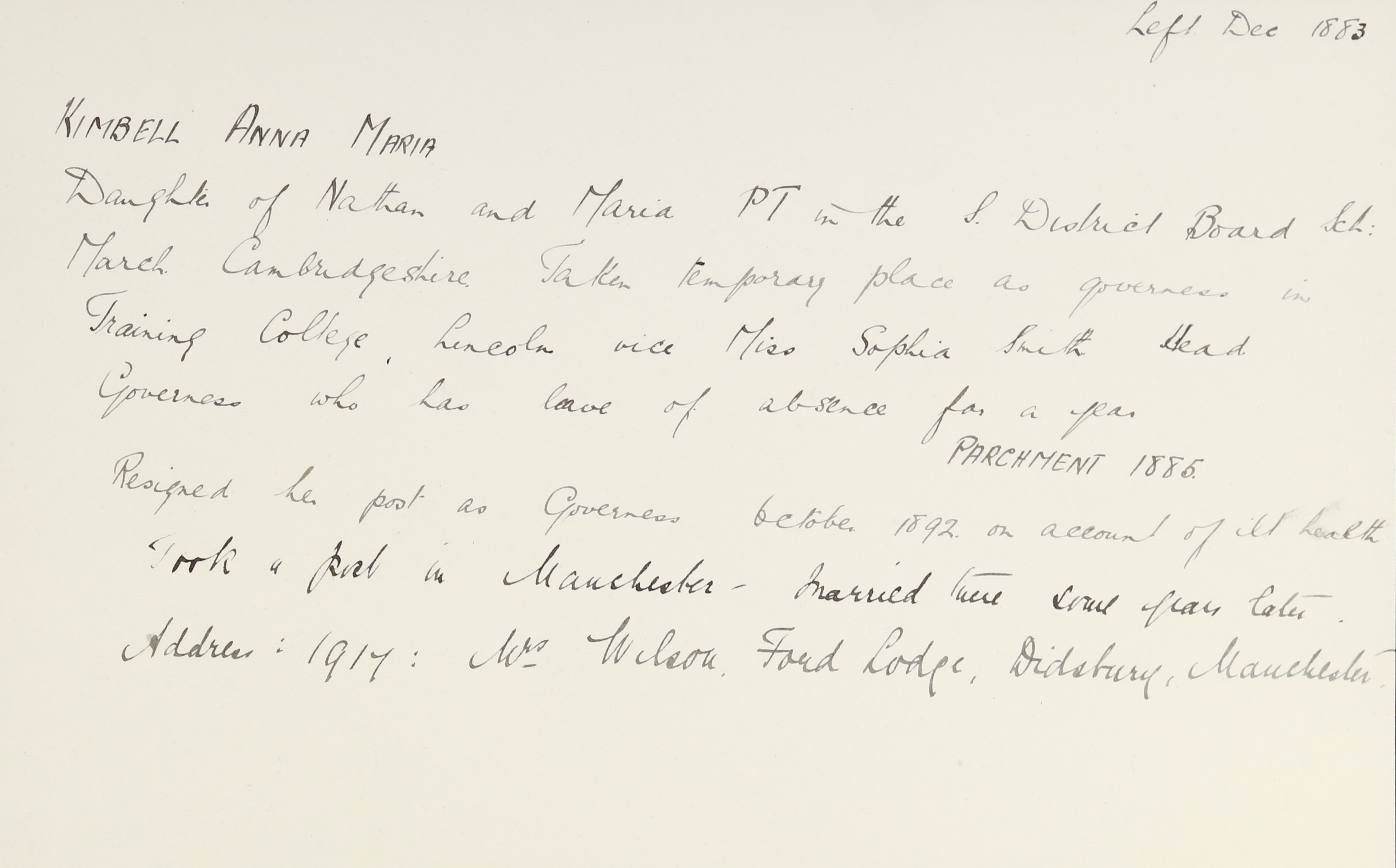 She is at Farm House, Walgrave. Her father and brother, Harry, are listed as ‘Carpenter’. Anna, her mother and siblings (Peter, Easton and Elizabeth) are unlisted. Her grandfather, Richard Kimbell (b. 1791), is listed as ‘Retired Carpenter’.