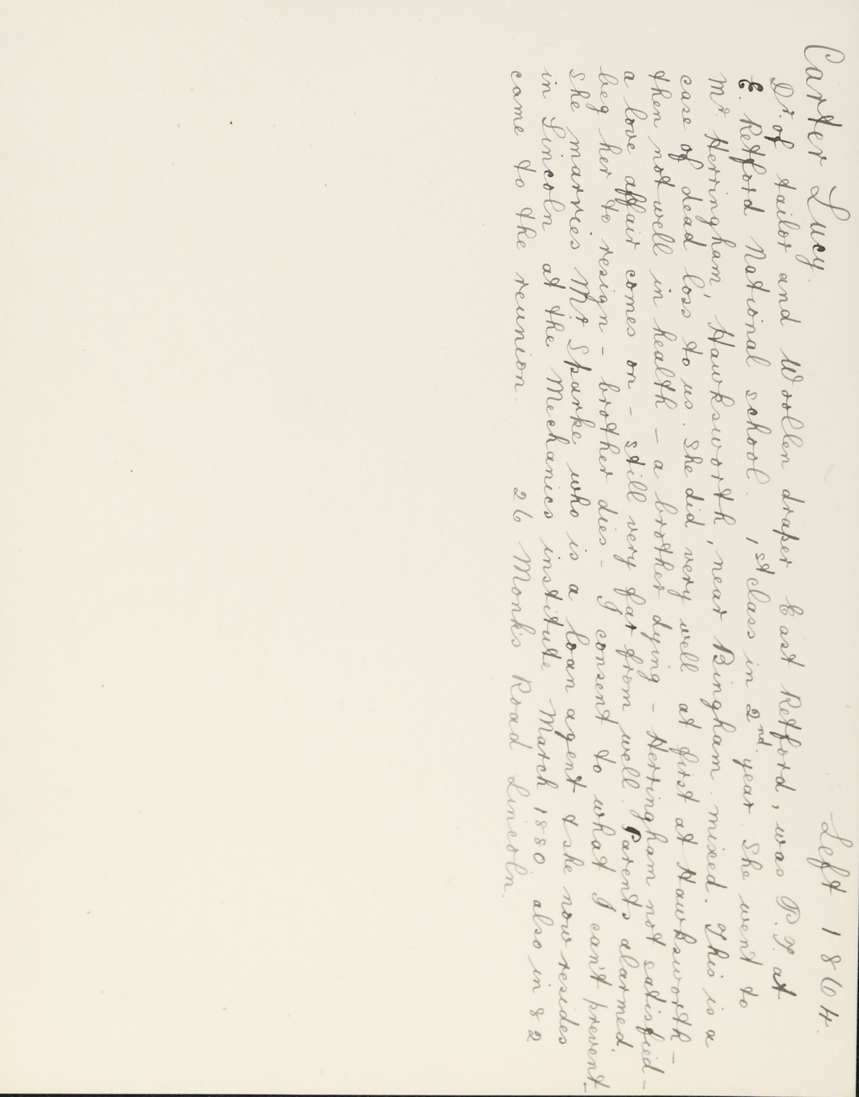 She is at Mechanics Institute, Lincoln. Her husband is listed as ‘Librarian’. Lucy and her children (George, Francis, Rosa and Arthur) are unlisted. There is a servant, Mary J Brooks (b. 1862).