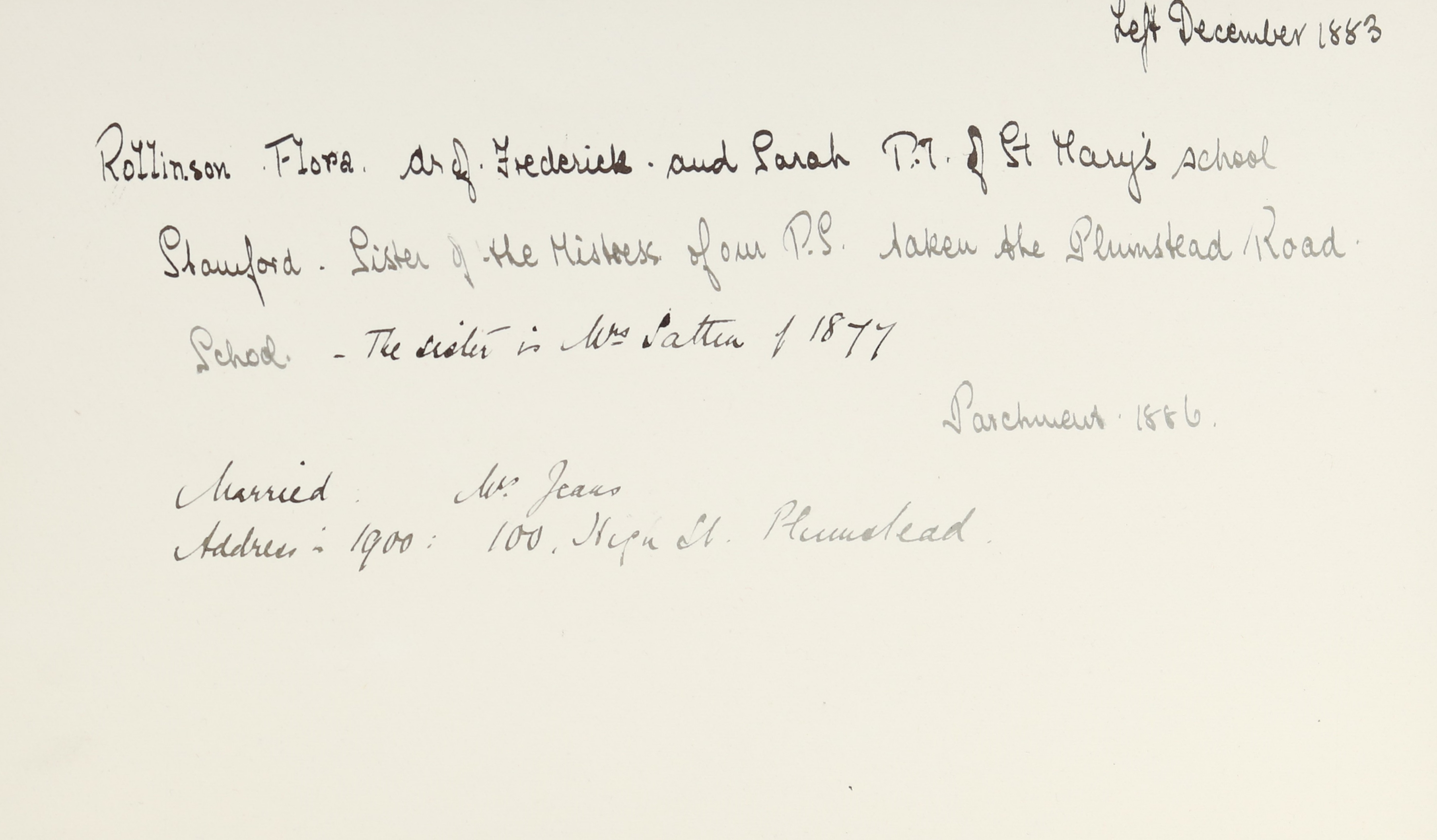 She is at Stamford Union Workhouse. Her father is listed as ‘Master of Workhouse’. Her mother is listed as ‘Matron of Workhouse’. Flora is listed as ‘Pupil Teacher’.