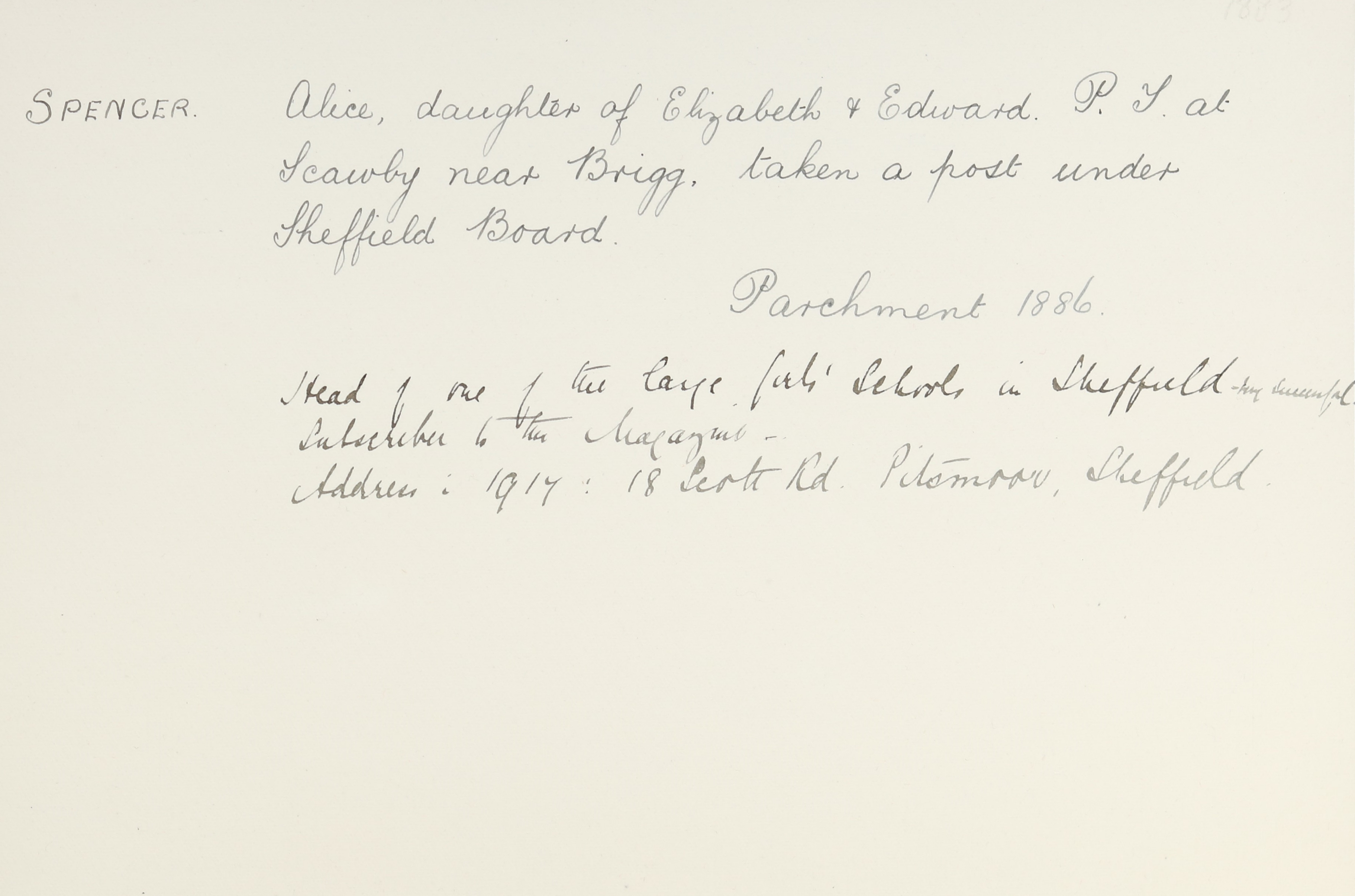 She is at 18 Scott Road, Sheffield. Alice is listed as ‘Head Teacher’. Her sisters, Fanny and Elizabeth, are unlisted. There is a servant, Clara Foulstone (b. 1894).