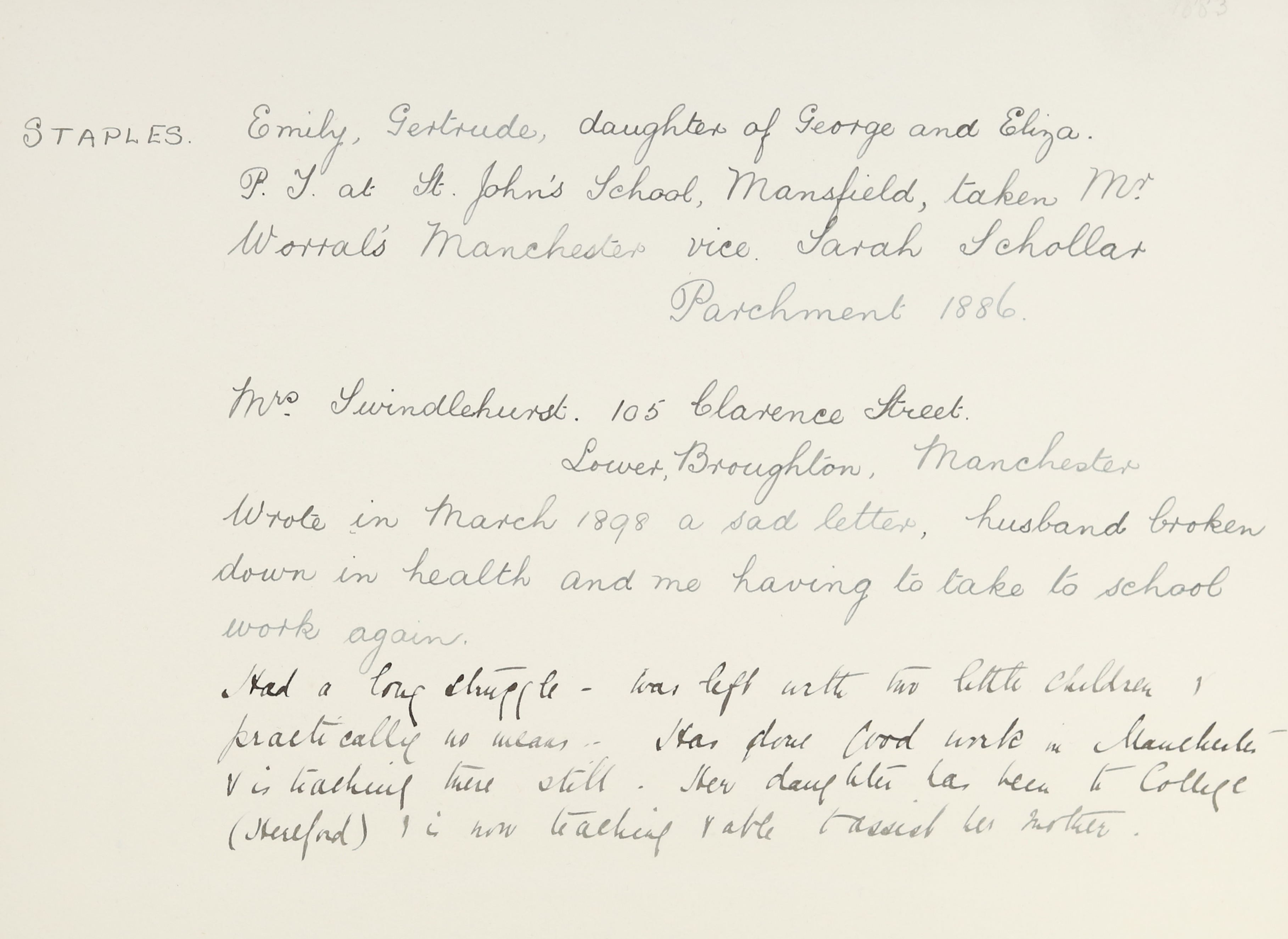 She is at Clarence Street, Broughton as a visitor. Thomas Smith (b. 1824) is listed as ‘Yarn Warehouseman’. His wife, Catherine Smith (b. 1827), is unlisted. His daughter, Mary J Smith (b. 1856), is listed as ‘National Schoolmistress’. His daughter, Margaret Smith (b. 1867), is listed as ‘Assistant Schoolmistress’. Emily is listed as visitor and ‘Board School Mistress’.