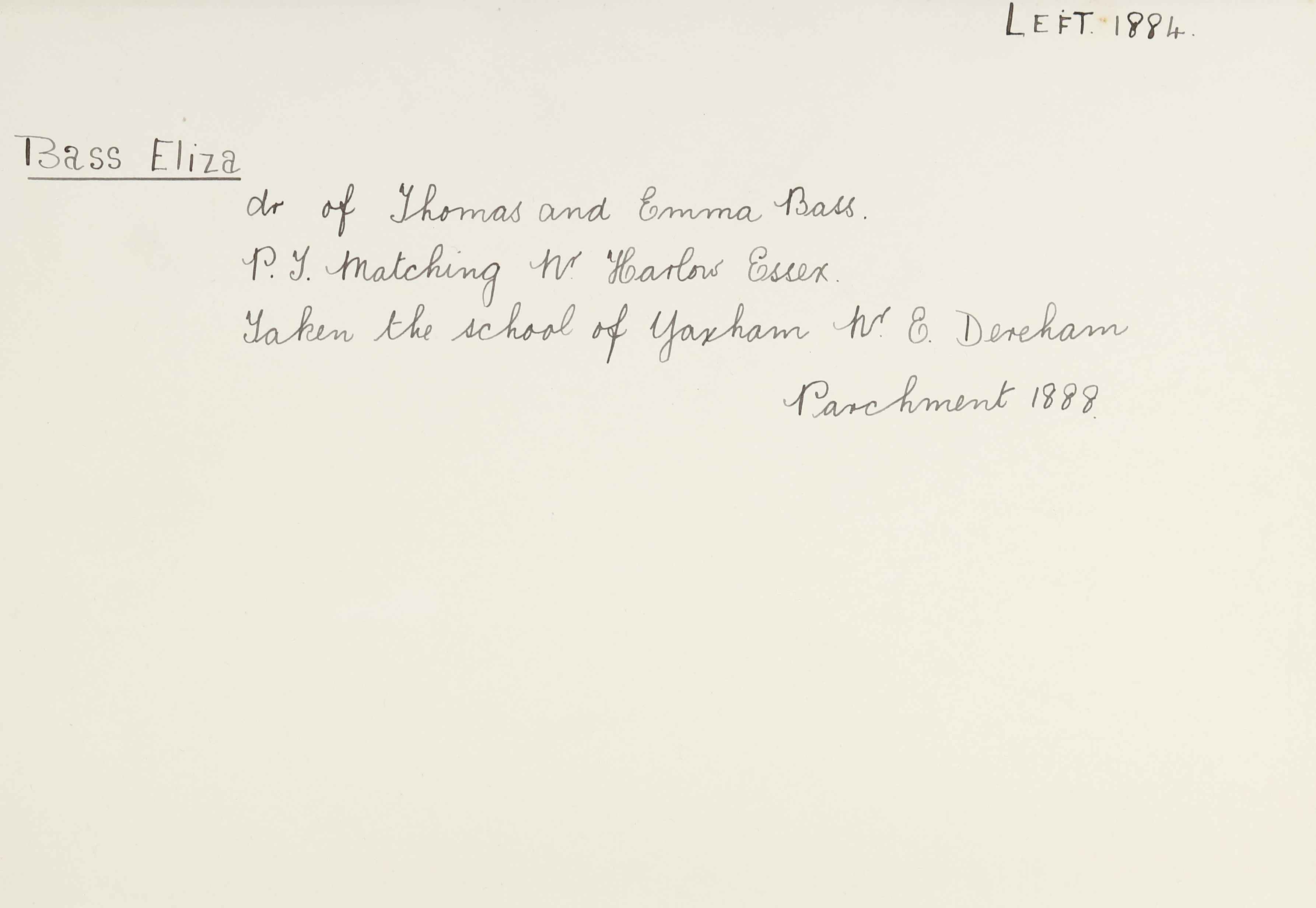 BASS, Eliza Jane of Stone Cottage, Yaxham, Norfolk, spinster died 29 May 1948. Probate London 11 September to John Reginald Bass, police sergeant. Effects £1482, 17s, 9d.