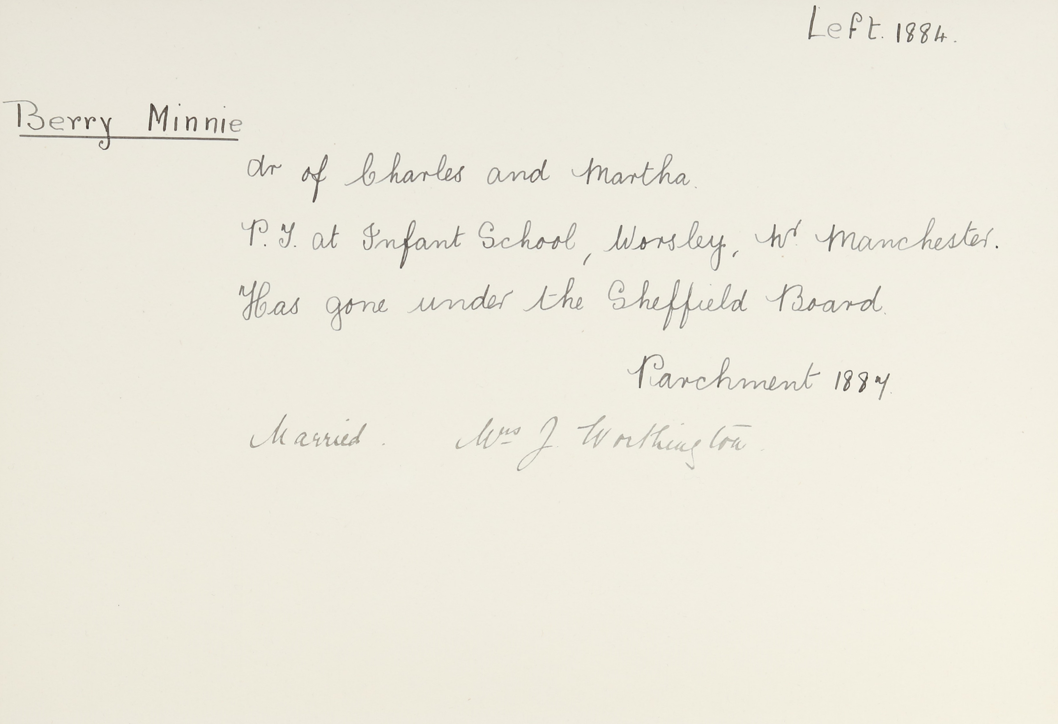 She is at Beech Cottage, Worsley, Barton upon Irwell. Her father is listed as ‘Former Clerk’. Her brothers, Charles and Frederick, are listed as ‘Clerk L U Rail Office’. Minnie is listed as ‘Pupil Teacher’. Her mother and siblings (Annie, Edwin, Flora, Amy and Lucy) are unlisted.