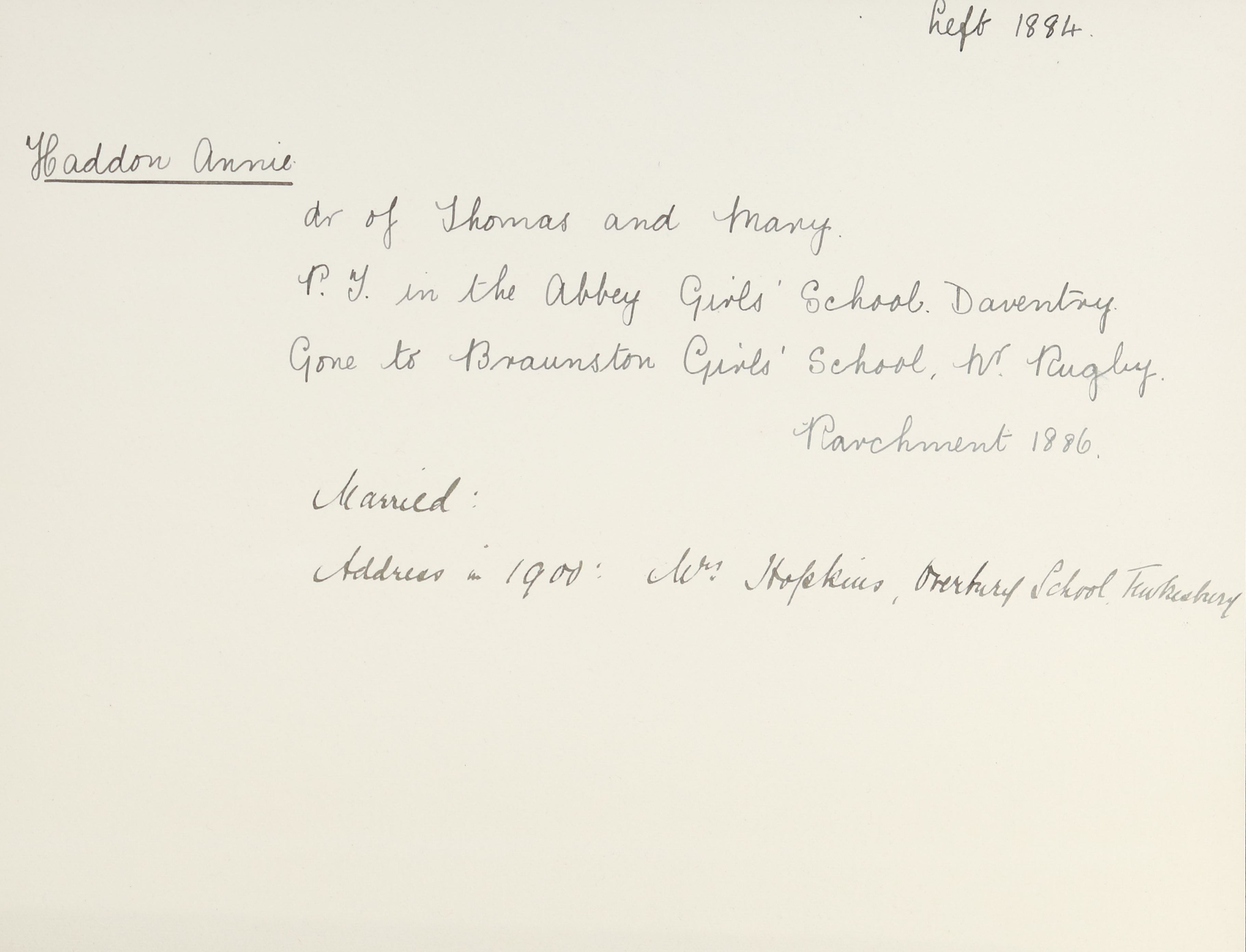 She is at 5 Abbey Street, Daventry. Her father is listed as ‘Agricultural Labourer’. Her brother, William, is listed as ‘Blacksmith’. Annie is listed as ‘Pupil Teacher’. Her mother is unlisted.