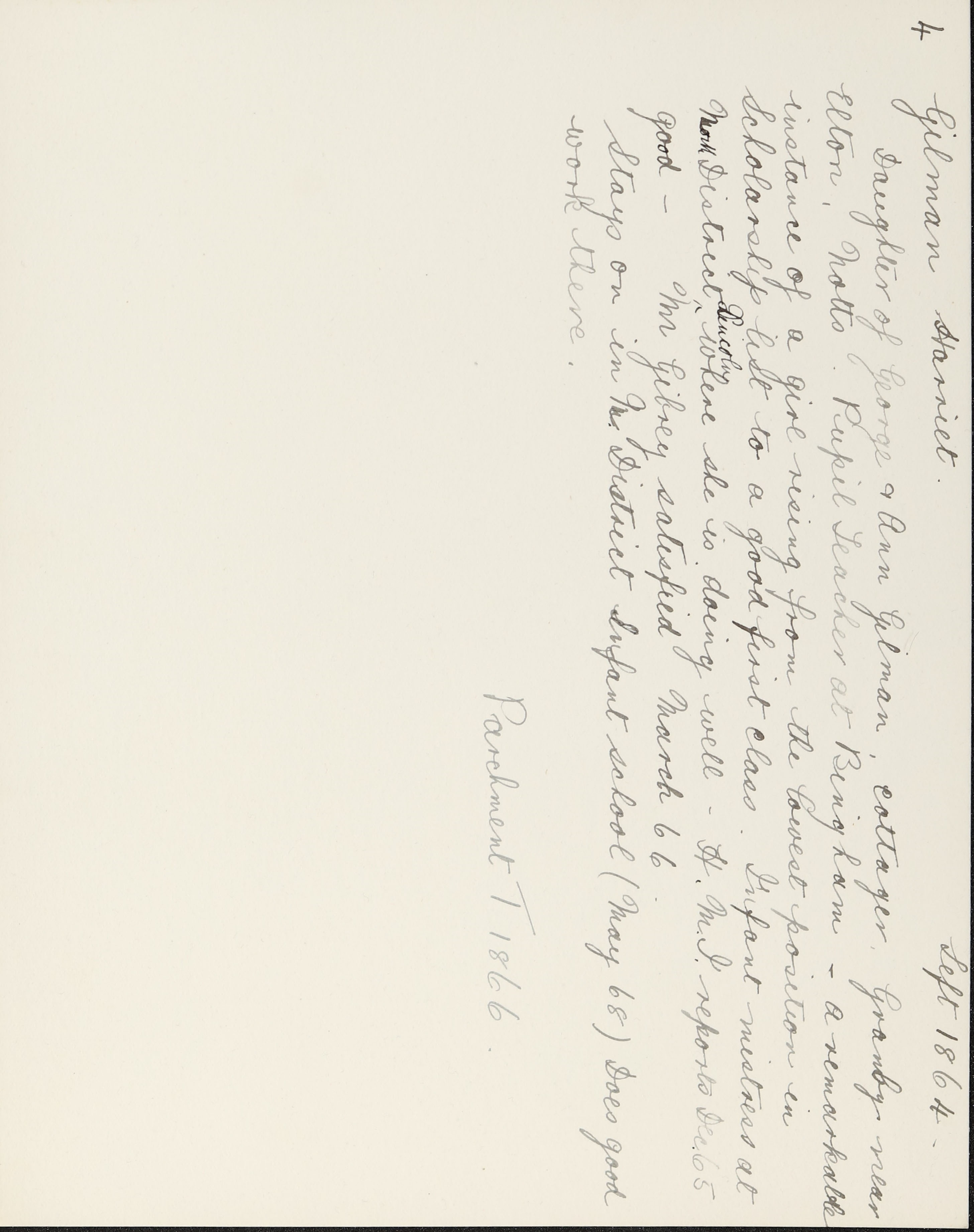 She is at Market Place, Bingham. Her father is listed as ‘Cordwainer Master Employing 1 Man’. Her sisters, Mary and Ann, are listed as ‘Shoe Binder’. Her brother. Thomas, is listed as ‘Cordwainer Master’. Harriett, her mother and sisters, Sarah and Martha, are unlisted.