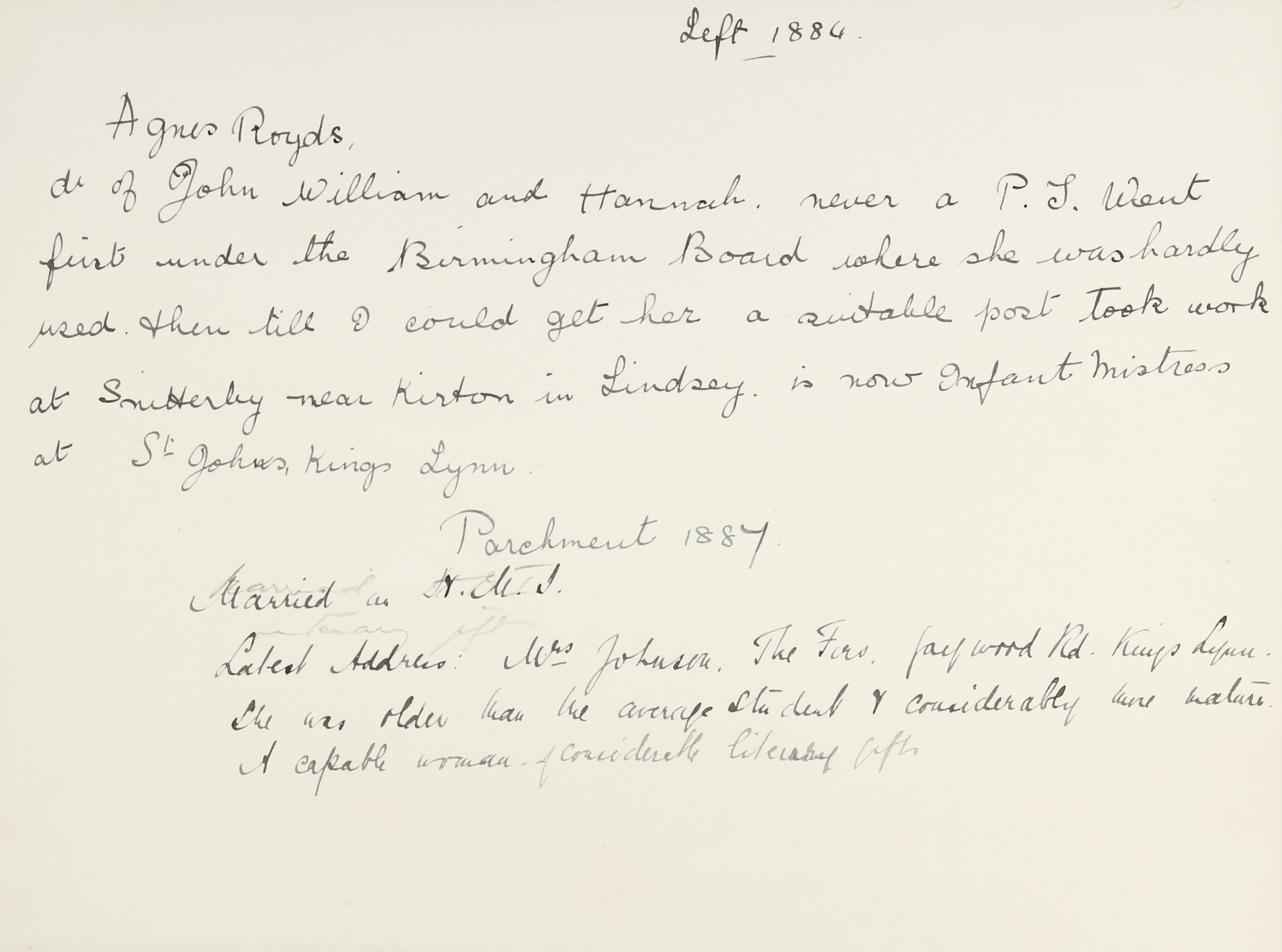 JOHNSON, Agnes of The Firs, Gaywood Road, Kings Lynn, Norfolk, widow, died 1 January 1923. Probate Norwich 8 February to Olive Mary Johnson and Florence Agnes Johnson, spinsters. Effects £1359, 18s, 7d.