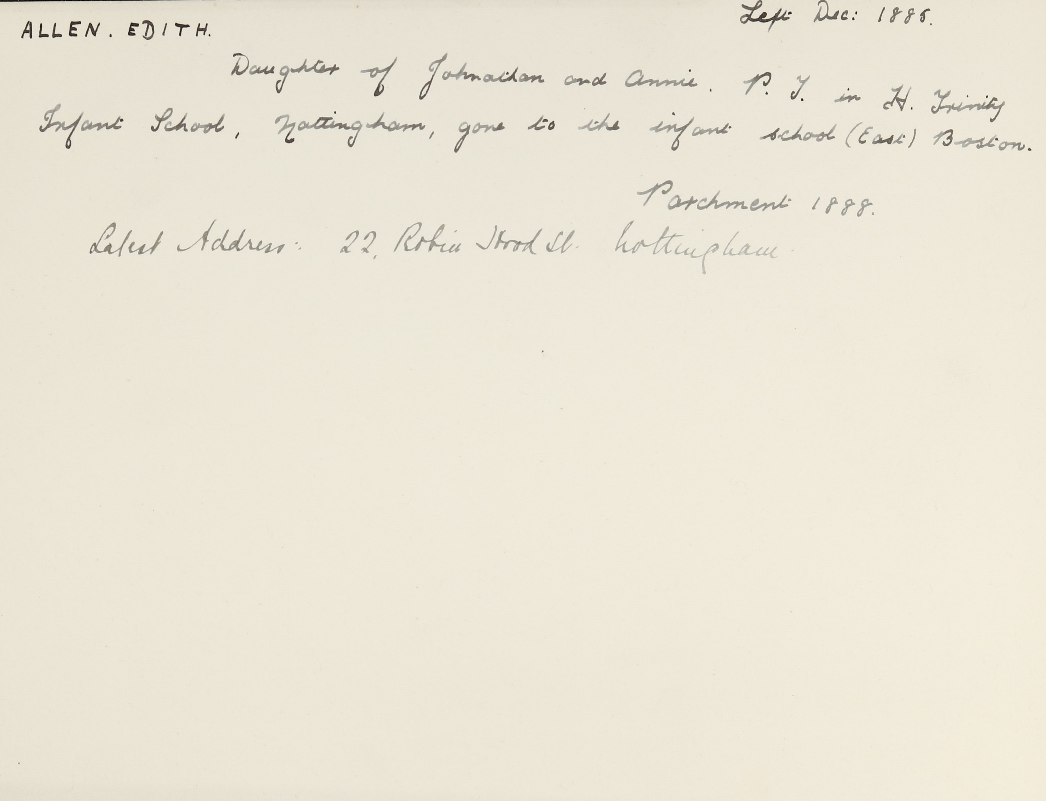ALLEN, Edith Mary of 79 Forest Road, West Nottingham, spinster died 16 September 1953 at The General Hospital, Nottingham. Probate Nottingham 23 November to Annis Gertrude Price, widow and Henry Thornton Masser, solicitor. Effects £448, 15s, 6d.