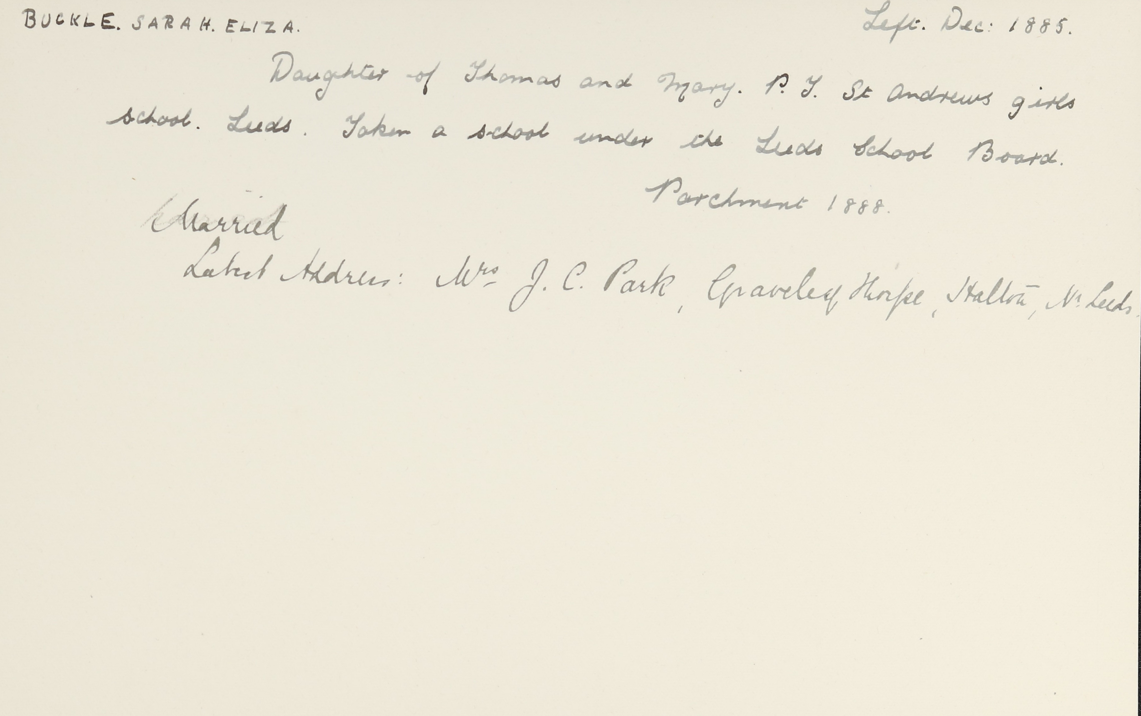 Sisters: Anne Buckle (b. 1860), Mary Hannah Buckle (b. 1862), Martha Buckle (b. 1867), Elizabeth Buckle (b. 1870), Alice Buckle (b. 1872) [LDTC 1893], Margaret Buckle (b. 1875)