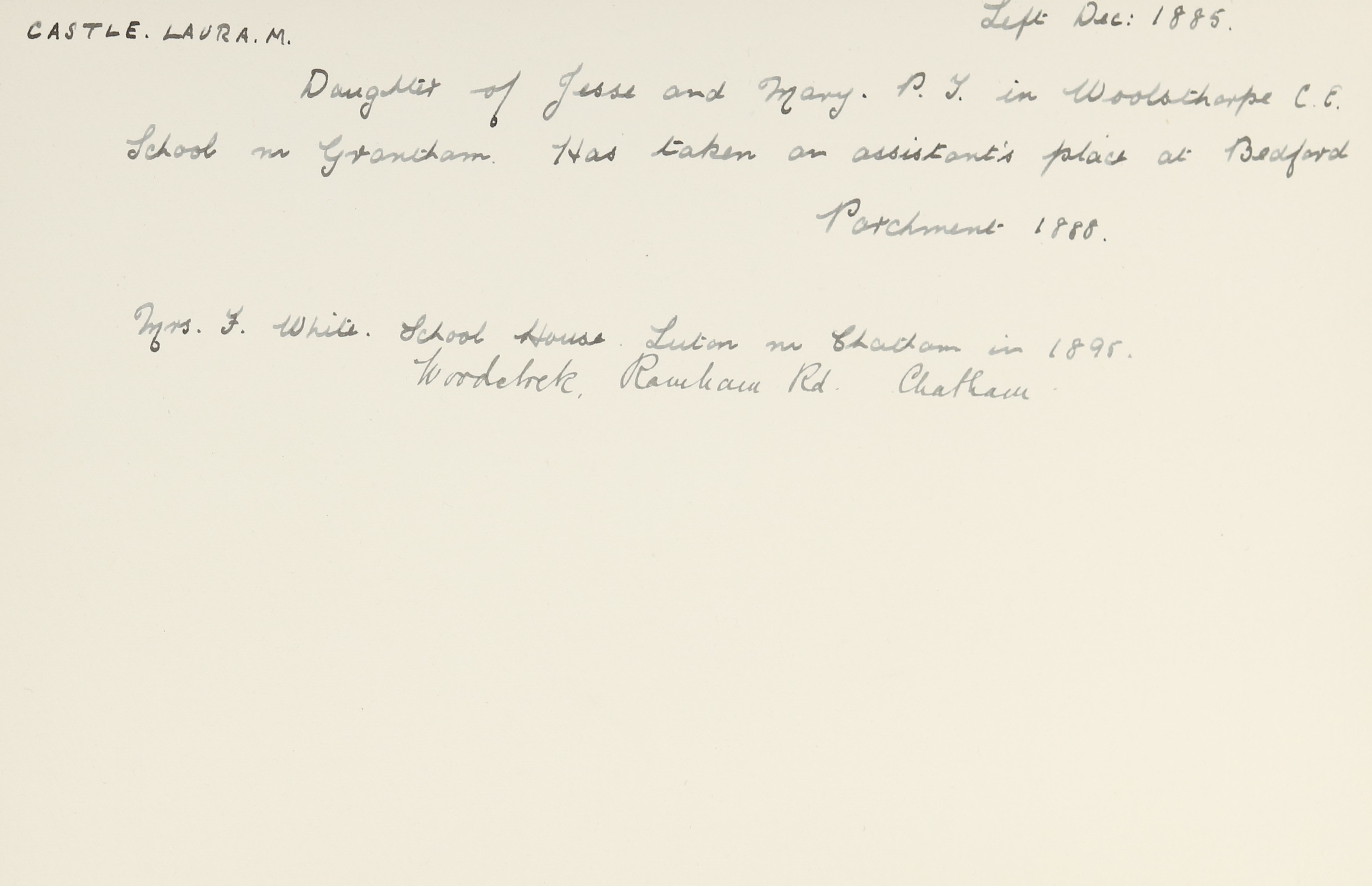 She is at School House, Village Street, Grantham. Her father is listed as ‘Elementary Schoolmaster’. Laura is listed as ‘Pupil Teacher’. Her brother, George, is listed as ‘Apprentice to Architect’. Her mother and sisters, Caroline and Eleanor, are unlisted.