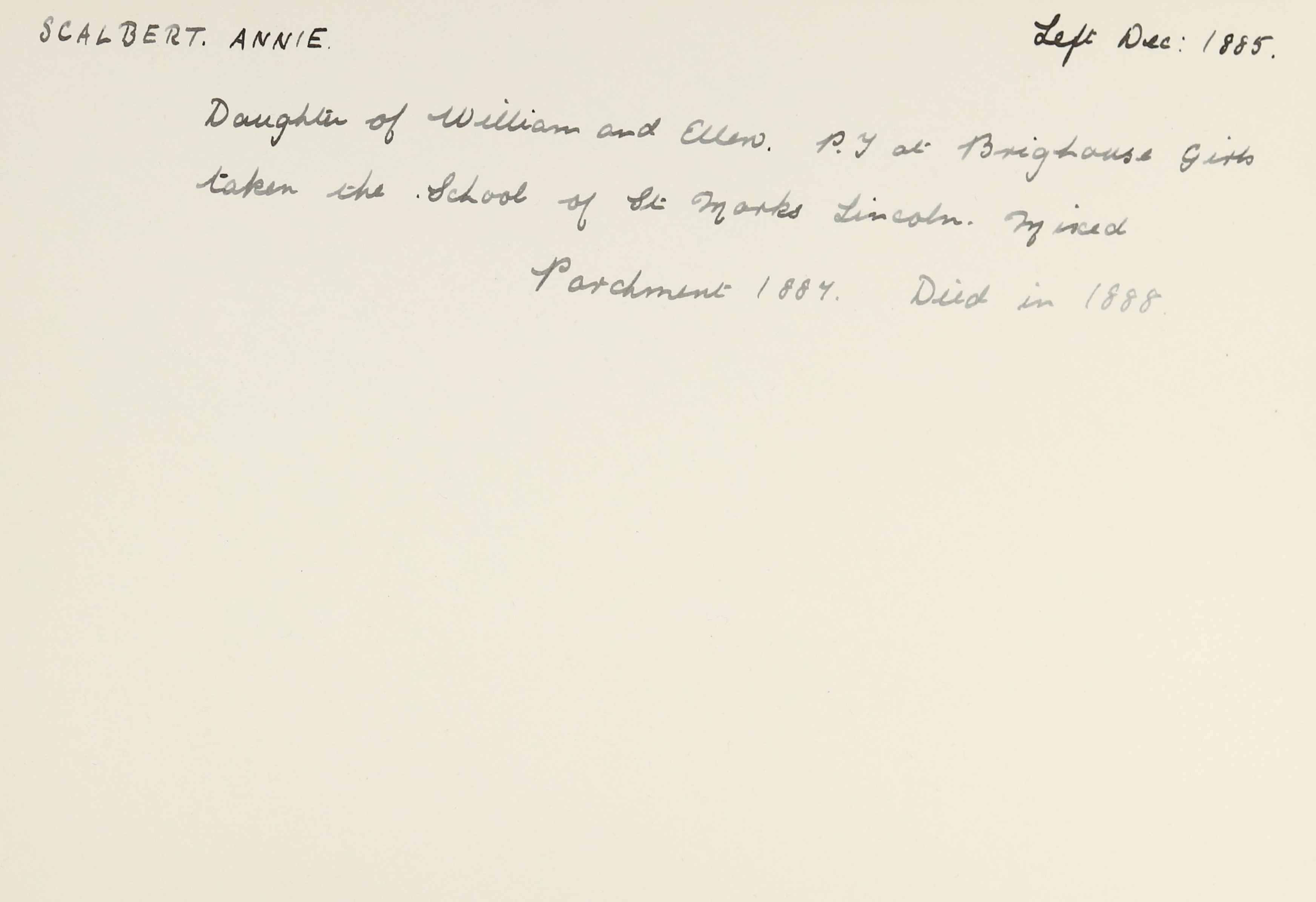 She is at 4 Haigh Street, Halifax. Her mother is listed as widow and ‘Dressmaker Employs 1 Assistant’. Annie is listed as ‘Pupil Teacher’. Her sister, Rhoda, and her grandmother, Mary Stevenson (b. 1811), are unlisted. There is a boarder, Andrew Morris (b. 1853), listed as ‘Newspaper Reporter’.