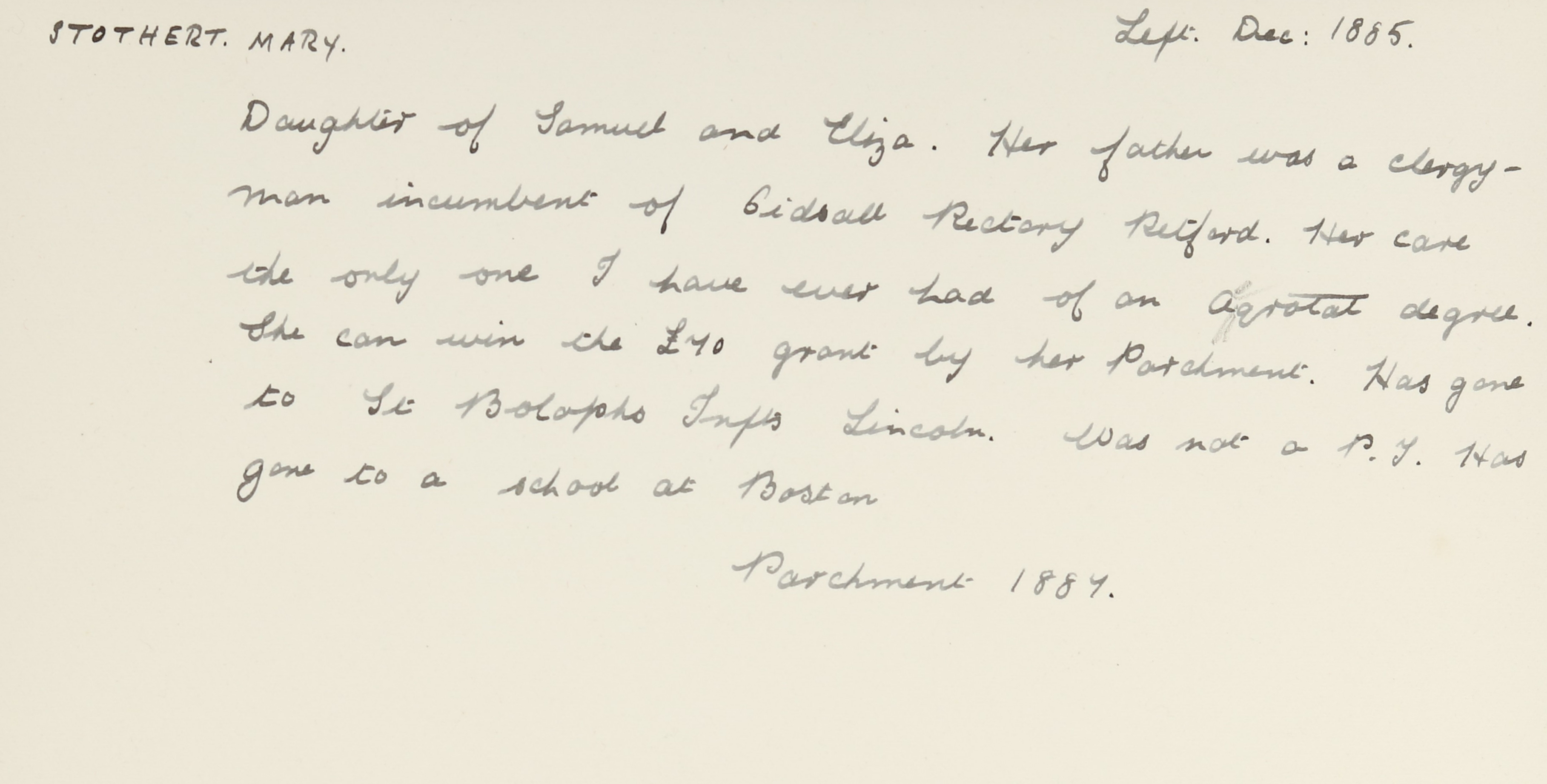 She is at Boultham Avenue, Lincoln as a visitor. Robert Mitchell (b. 1847) is listed as ‘Corp Screen Maker’. His wife and daughter, Lily Bavin Mitchell (b. 1873), are unlisted. His daughter, Rose Mitchell (b. 1870), is listed as ‘Knitting Depot’. There is a boarder, Edith Annie Ellis Sutton (b. 1868), listed as ‘Schoolmistress Girls’. Mary is listed as visitor and ‘Schoolmistress Girls’.