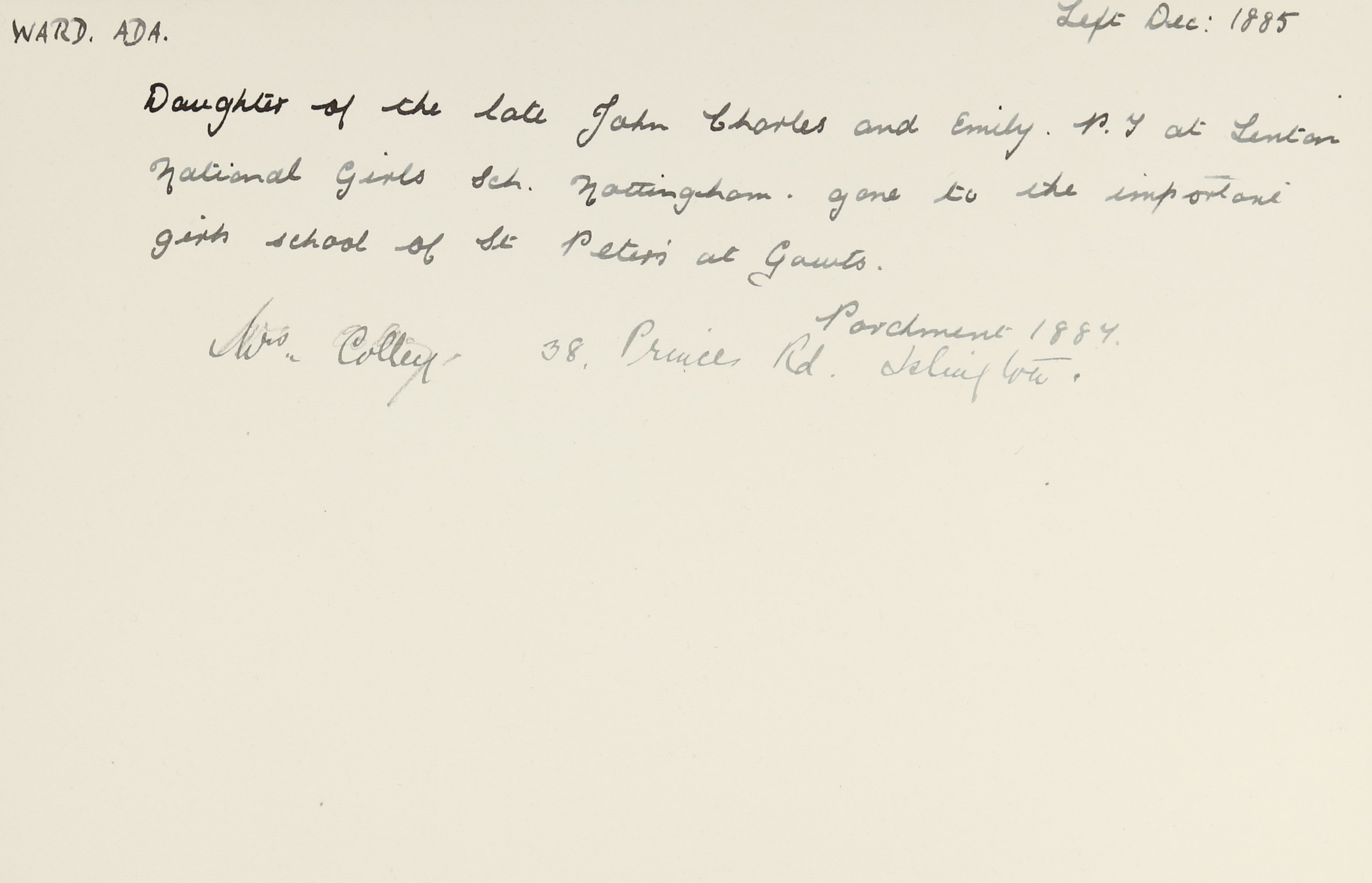 She is at 46 Park Street, Lenton. Her uncle, Samuel Vickers (b. 1821), is listed as widower and ‘Dyer’. Her mother is listed as widow and ‘Milliner’. Ada is listed as ‘Pupil Teacher’.