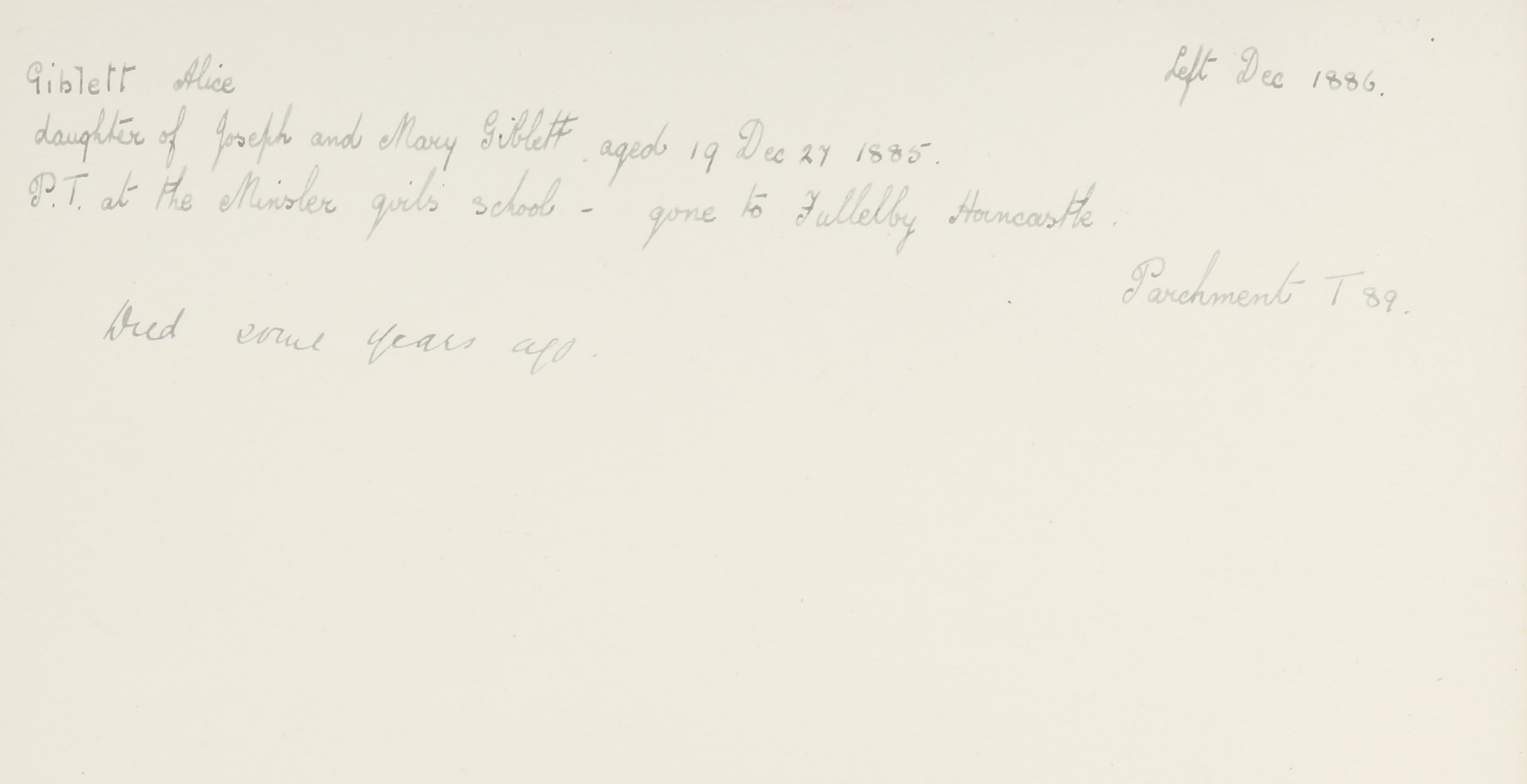She is at Minster Yard, Beverely. Her mother is listed as widow and ‘Dressmaker’. Alice is listed as ‘Pupil Teacher’. Her sister, Mabel, is unlisted.