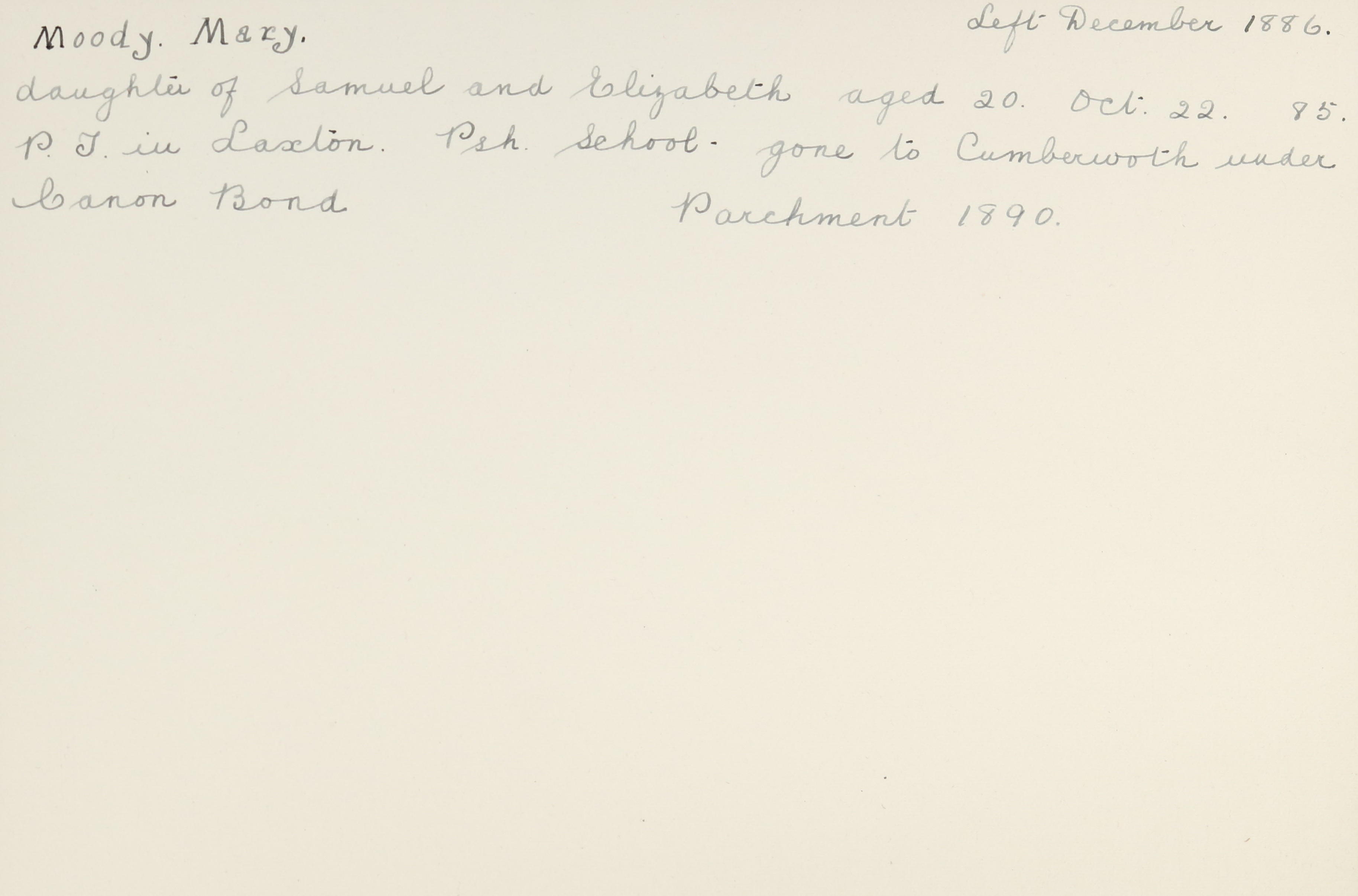 MOODY, Mary of Laxton, Nottinghamshire spinster died 21 September 1925. Administration Nottingham 28 October to Sam Moody, cordwainer. Effects £268, 2s, 10d.