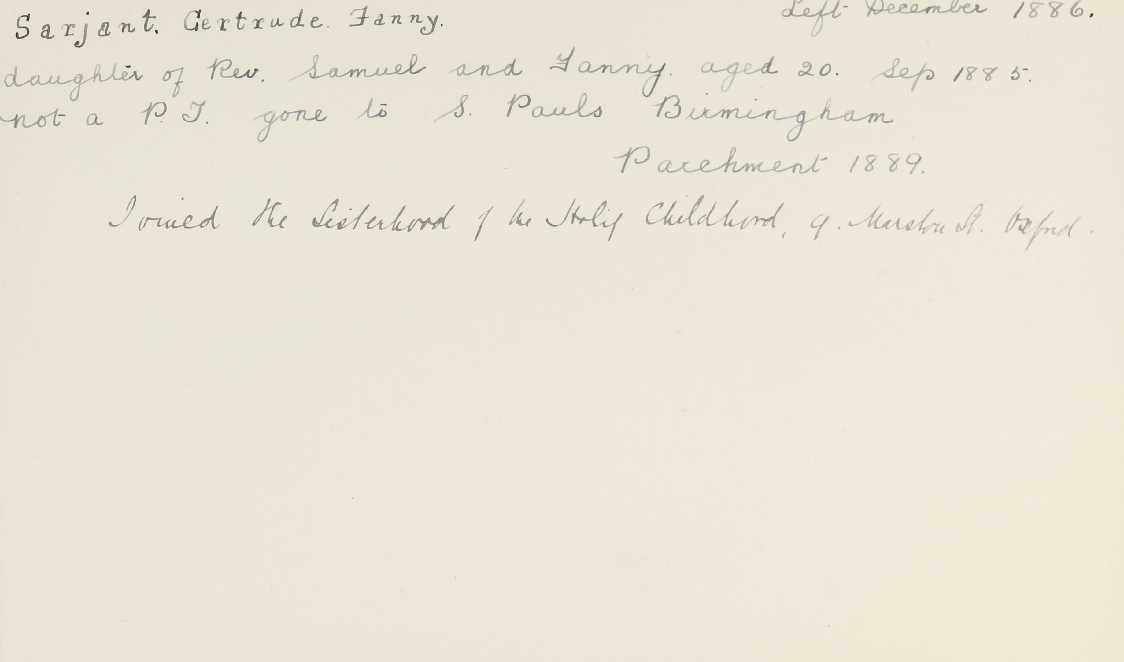 She is at 9 Marston Street, Oxford. Everyone in the house (apart from the servant) are listed as ‘Boarder of Sisterhood’. Charlotte C Mallam (b. 1852) and Alice Collins (b. 1845) are listed as ‘Certificated Schoolmistress’. Emily S Everett (b. 1863), Lilian Armstrong and Gertrude are listed as ‘Certificated Assistant Teacher’. There is a servant, Helen A L Hunt (b. 1884).
