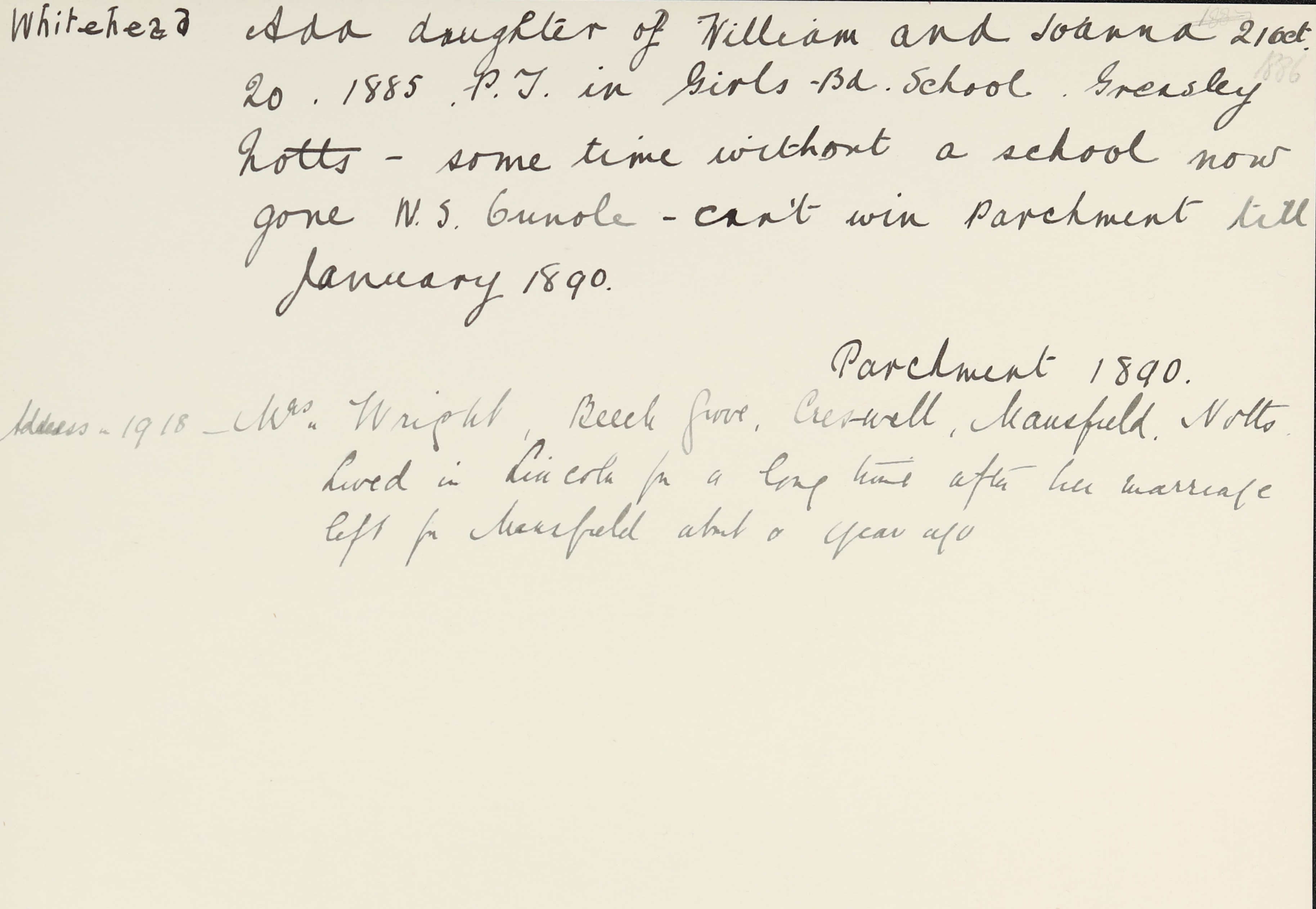 Brothers: William Alfred Whitehead (b. 1861), Edward Frost Whitehead (b. 1863), Herbert J Whitehead (b. 1866), Arthur Ellis Whitehead (b. 1868), Frank Bearman Whitehead (b. 1870)