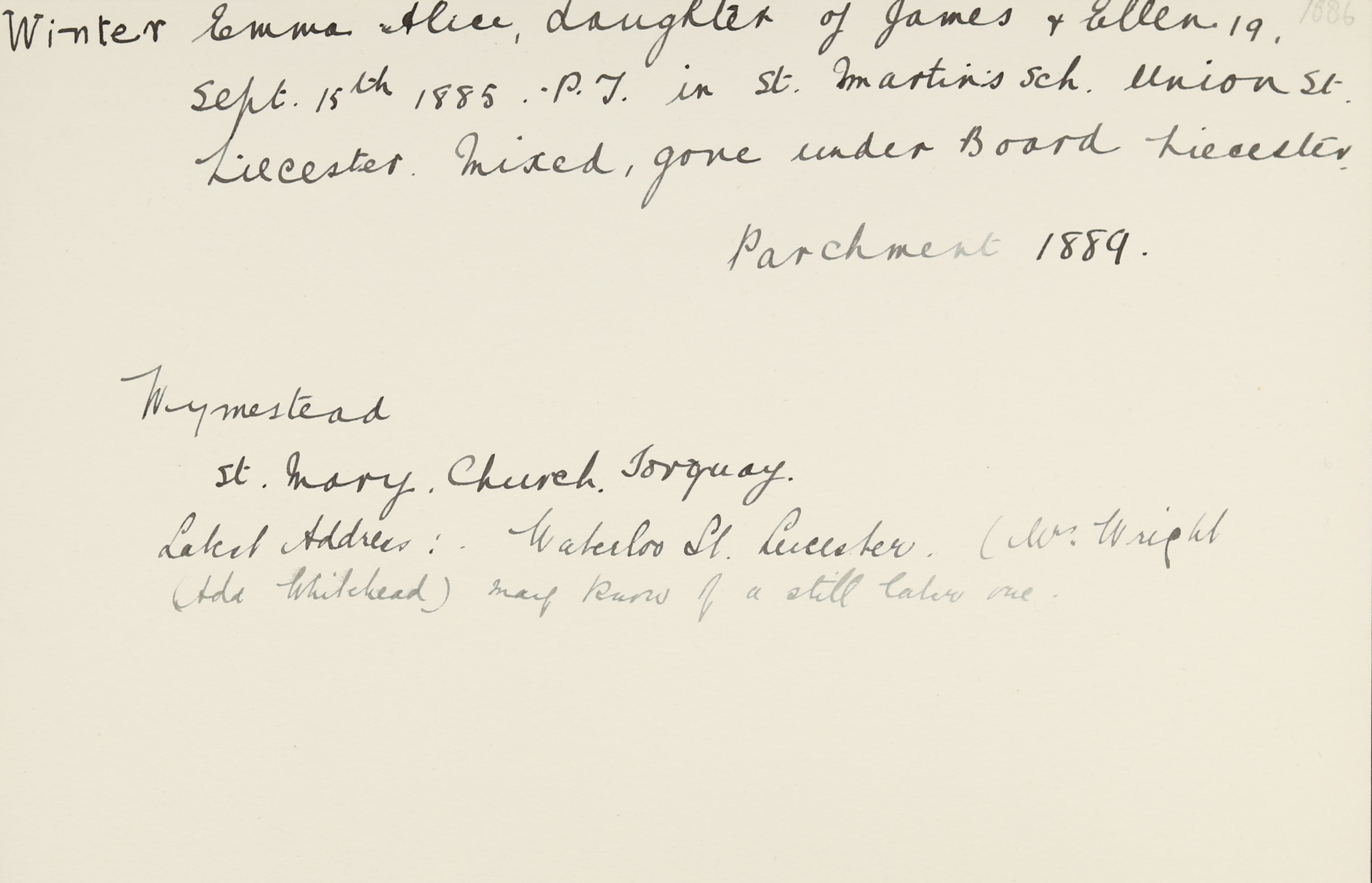 WINTER, Alice Emma of 3 Hedgerow Lane, Kirby, Muxloe, Leicestershire, spinster died 27 September 1945. Probate Llandudno 22 November to Rose Ellen Winter, spinster. Effects £3847, 15s.