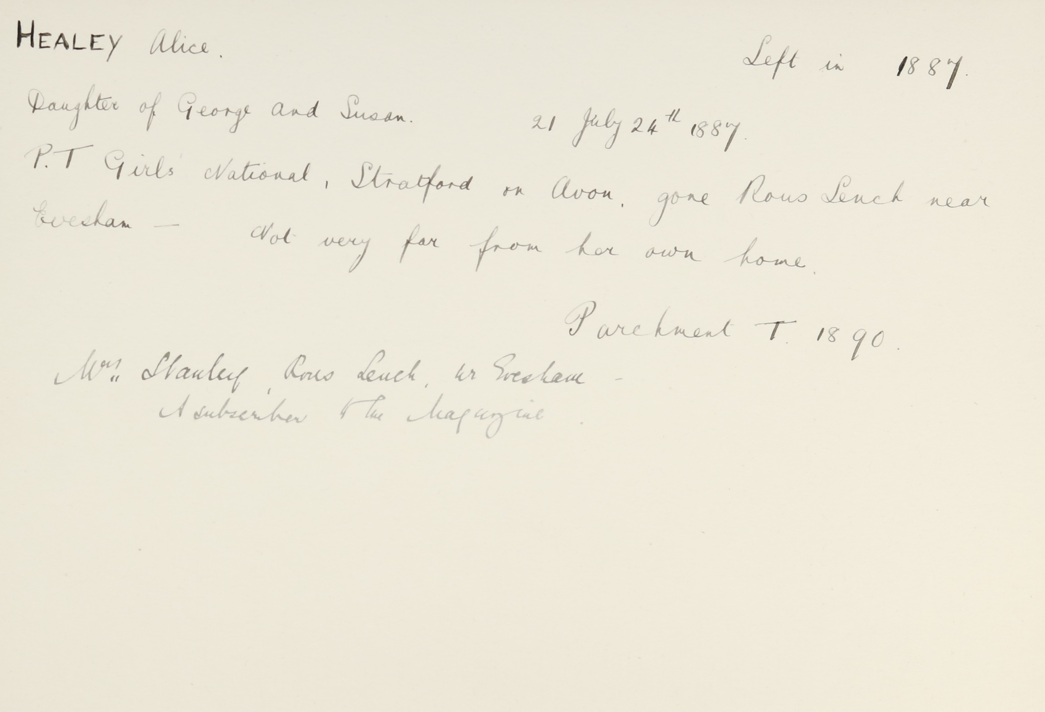 She is at Church Street, Stratford on Avon. Her family is in the home of the Parish Vicar. Her father is a coachman to the said vicar. Alice, her mother and siblings (Walter, James and Henry) are unlisted. Her brother, Alfred, is listed as ‘Bricklayer’.
