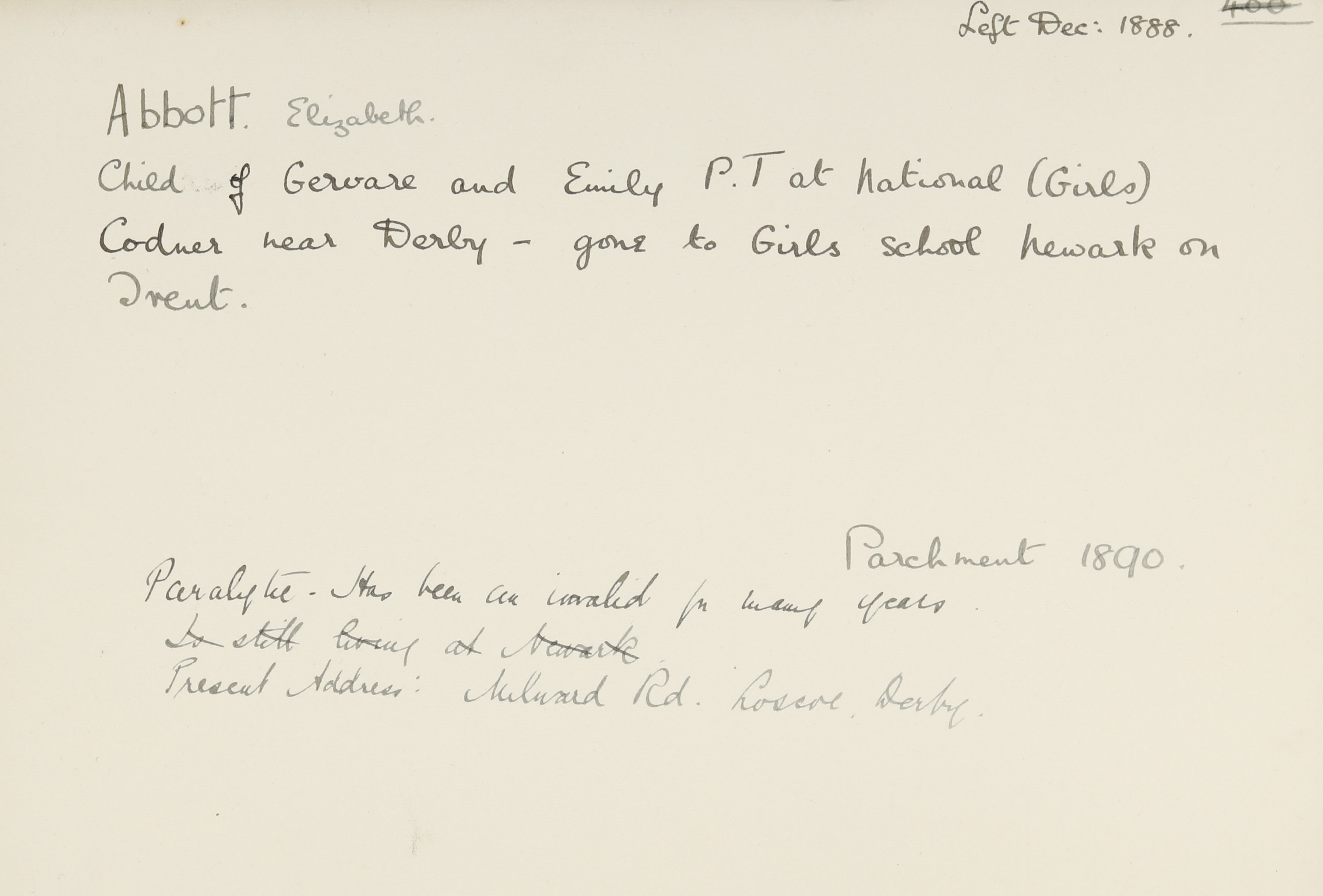 ABBOTT, Elizabeth of Milward Road, Loscoe, Derbyshire, spinster died 10 December 1926. Probate Derby 4 February to Eliza Bullock (wife of George Bullock) and Frank Abbott Bullock, electrical engineer. Effects £1282, 14s, 10d.
