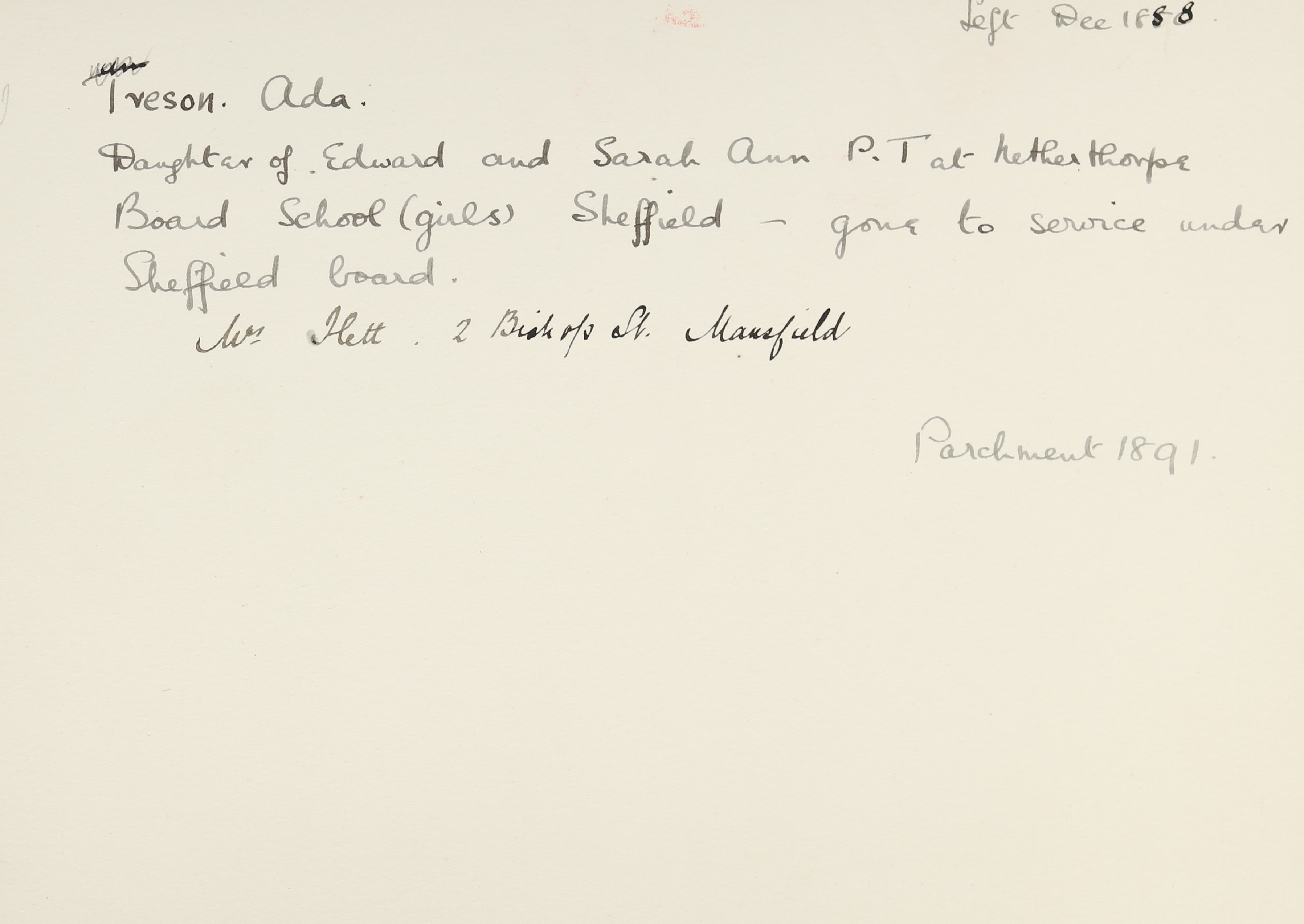 She is at Bedford Street, Sheffield. Her father is listed as ‘Bricklayer’. Ada, her mother and siblings (Emma, William and Walter) are unlisted.