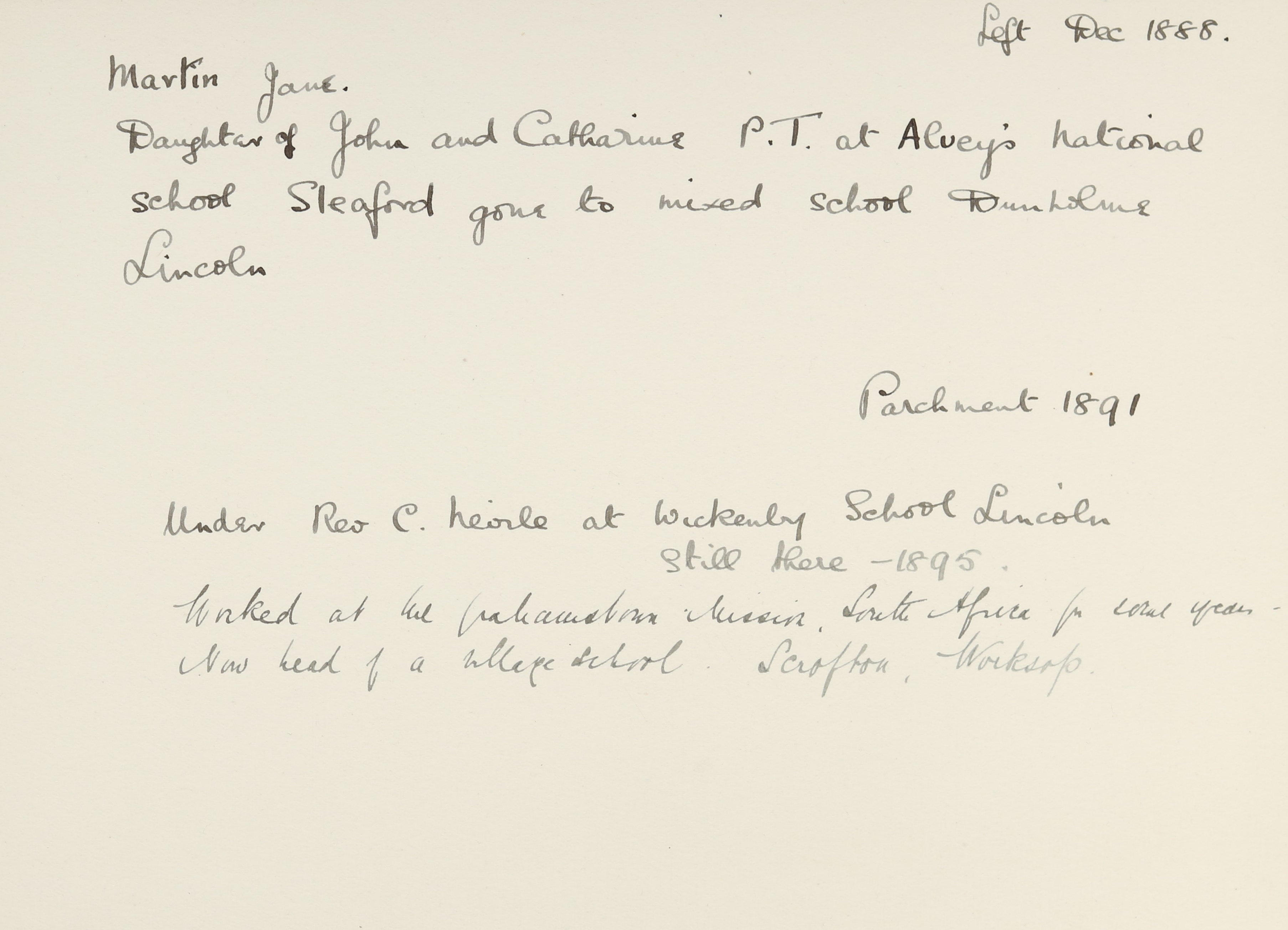 She is at St Chads Church, Ryland Lane, Dunholme. Jane is listed as ‘School Mistress’. Her sister, Mary, is listed as ‘Housekeeper’.