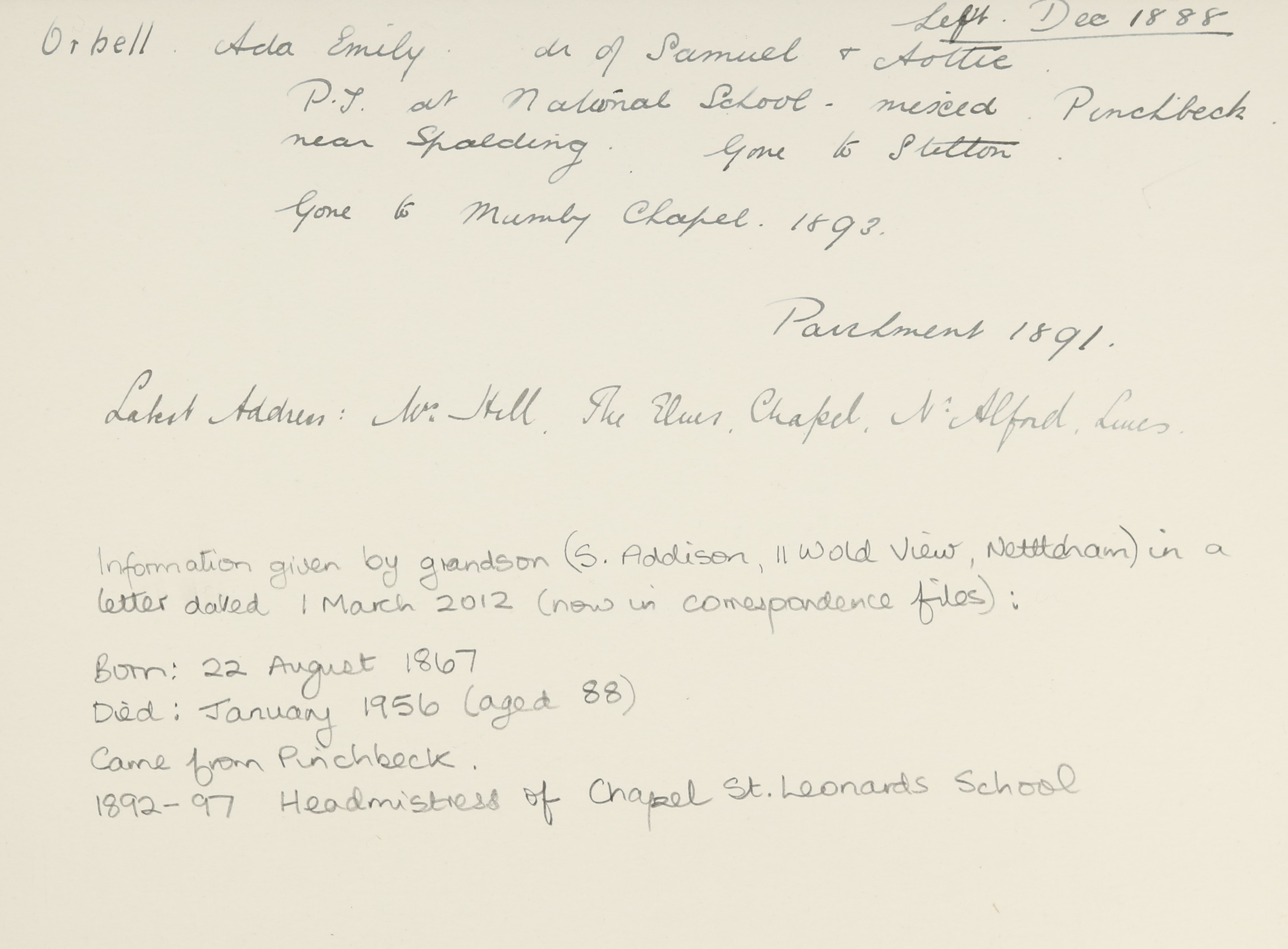 She is at Orbells Lodge, Brington, Thrapston. Her father is listed as ‘Farmer 126 Acres Employing 5 men and 3 boys’. Ada, her mother and siblings (Walter, Lizzey and Harry) are unlisted. There is a servant, Ellen Smeter (b. 1855). There is a farm servant, Frederick Winsor (b. 1855).