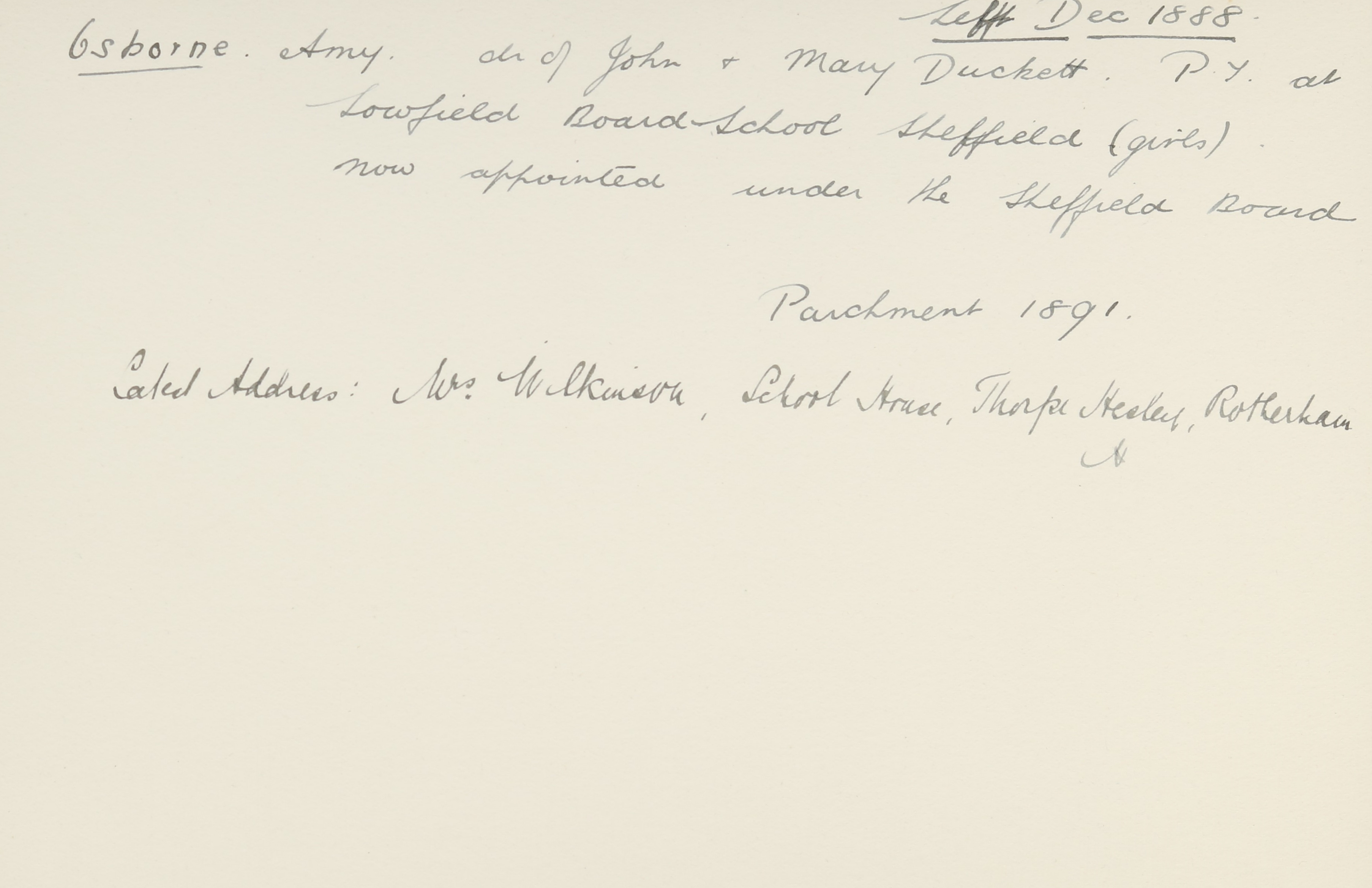 She is at Lound School House, Ecclesfield. Her father is listed as ‘Certificated Schoolmaster’. Her mother is listed as ‘Certficated Schoolmistress’. Amy and her siblings, Alfred and Edith, are unlisted. There is a servant, Fanny Summers (b. 1869).