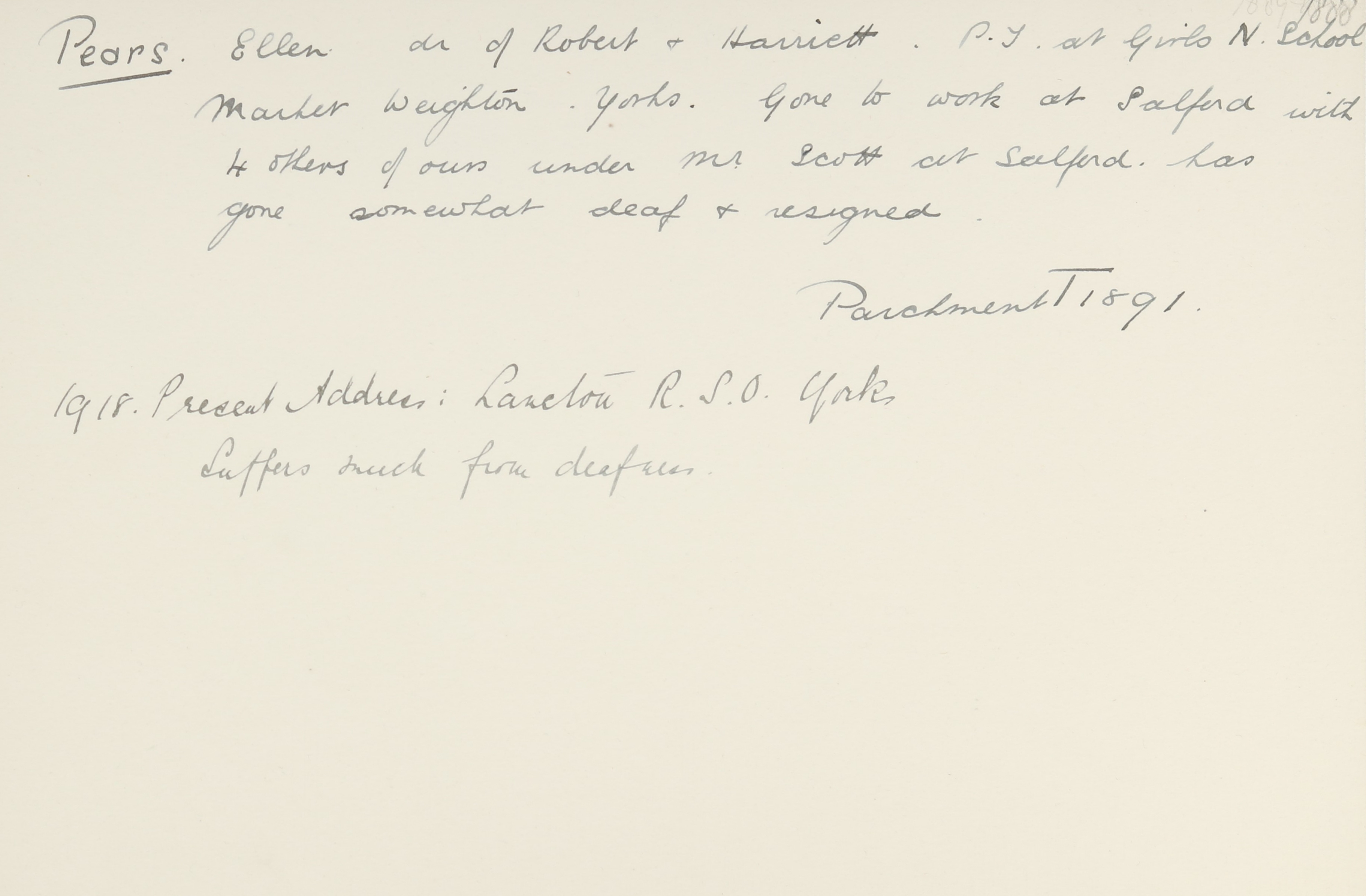 She is at Mask Farm, Pocklington. Her father is listed as ‘Farmer’. Her mother, siblings (Annie and Robert) and her married sister, Elizabeth Smith, are unlisted. Her brother, William, is listed as ‘Farmers Son’. Her brother-in-law, James Smith (b. 1864), is listed as ‘Carrier’. Ellen is listed as ‘Schoolmistress National’. There is a farm servant, Sam Maffin (b. 1877).