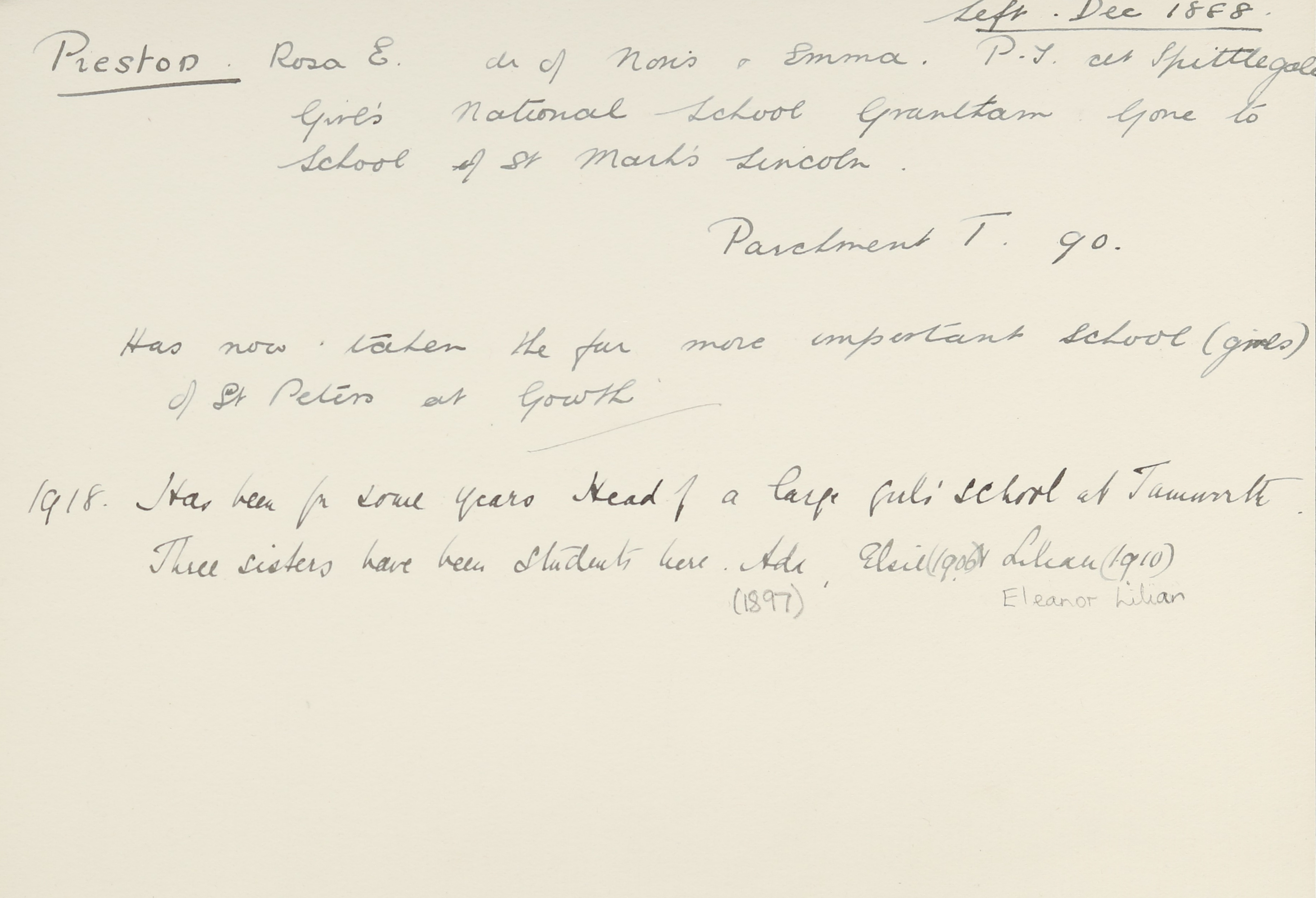 Sisters: Ethel May Preston (b. 1873), Ada Annie Preston (b. 1875) [LDTC 1897], Florence Alice Preston (b. 1878), Mabel Preston (b. 1880), Marian Speat Preston (b. 1882), Elsie Maud Preston (b. 1884) [LDTC 1906], Olive Lilian Eleanor Preston (b. 1889) [LDTC 1910], Kathleen Kennerley Preston (b. 1891)