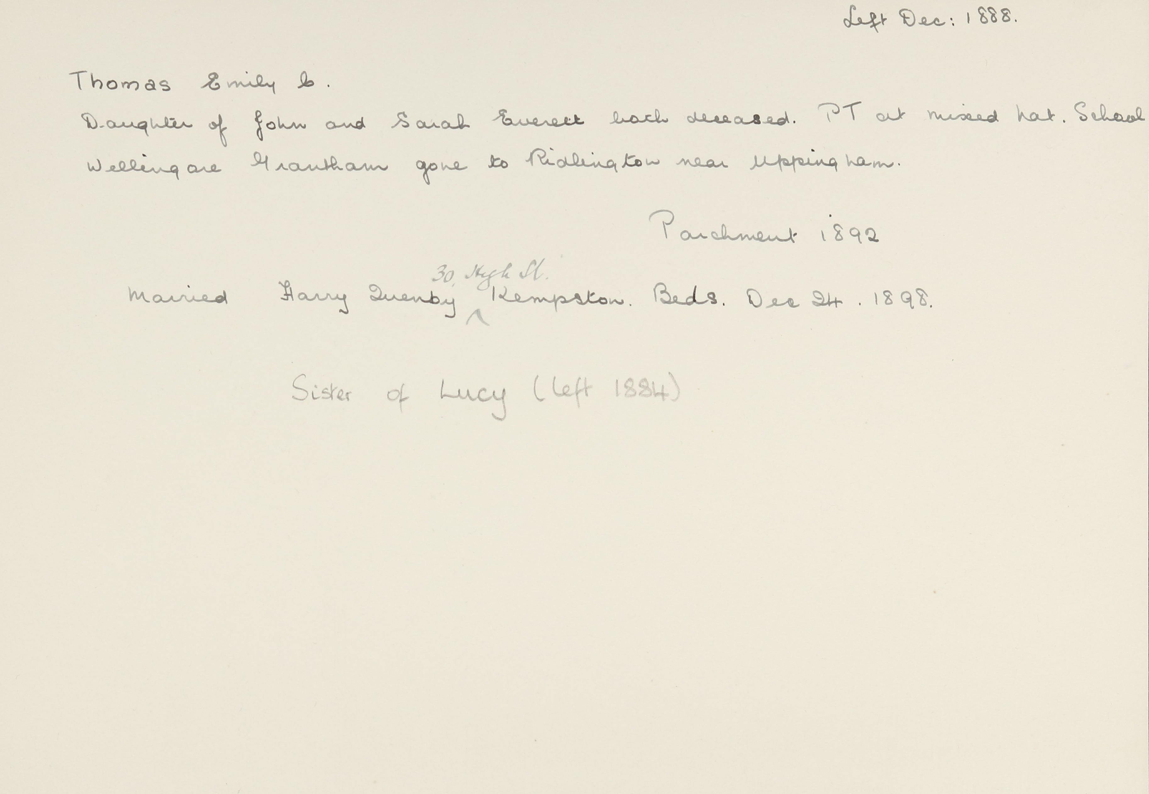 She is at 5 High Street, Wellingore. Her father is listed as widower and ‘Wheelwright’. Her sister, Lucy, is listed as ‘Pupil Teacher’. Emily and her sister, Mary, are unlisted.