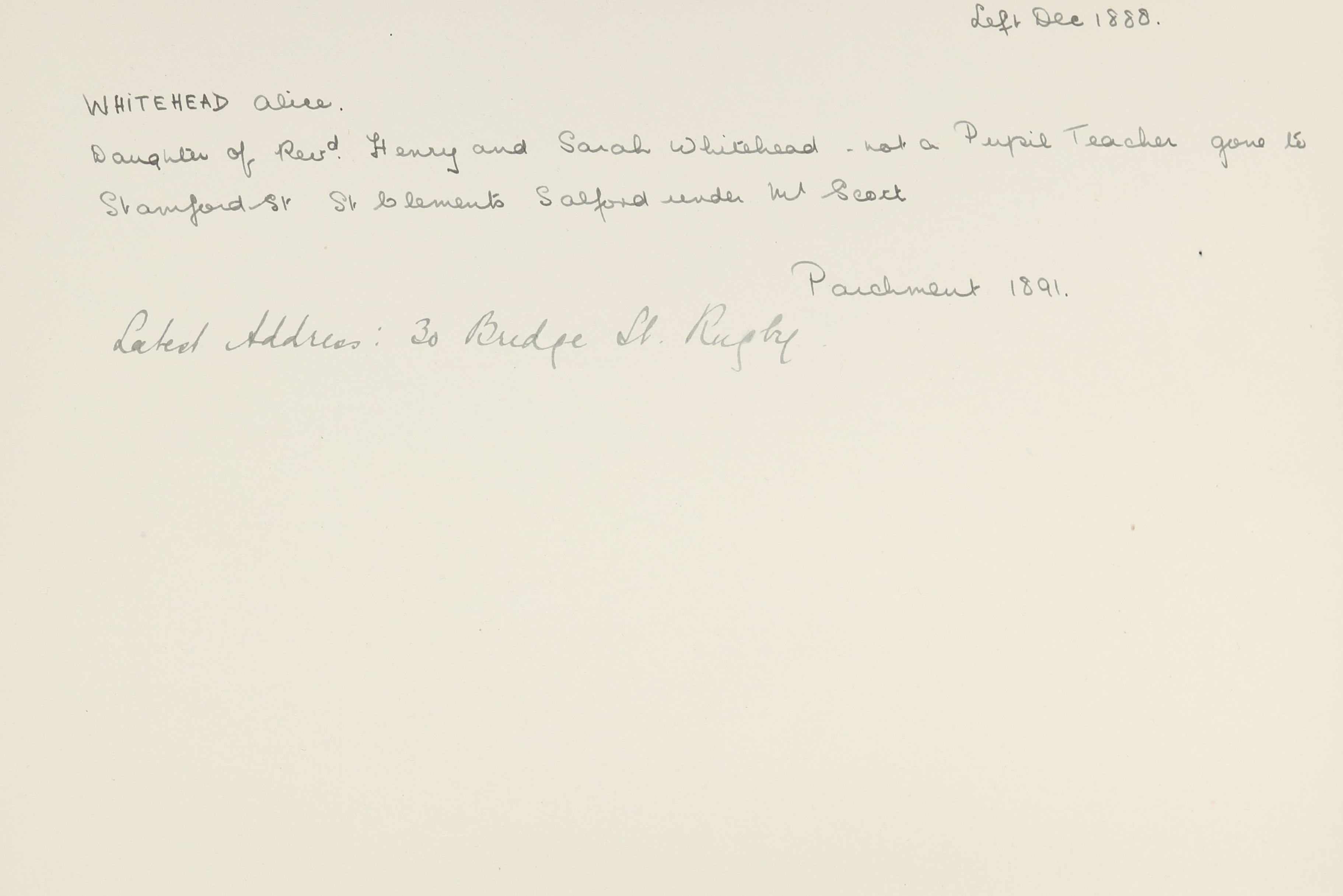 She is at 30 Bridge Street, Rugby as a boarder. Alfred J Harding (b. 1867) is listed as ‘Butler’. His wife, Mary Harding (b. 1865), and son, Horace Harding (b. 1895), are unlisted. Edith Styles (b. 1831) is an unlisted visitor. Alice is listed as boarder and ‘Head Certificated Mistress Elementary School’.