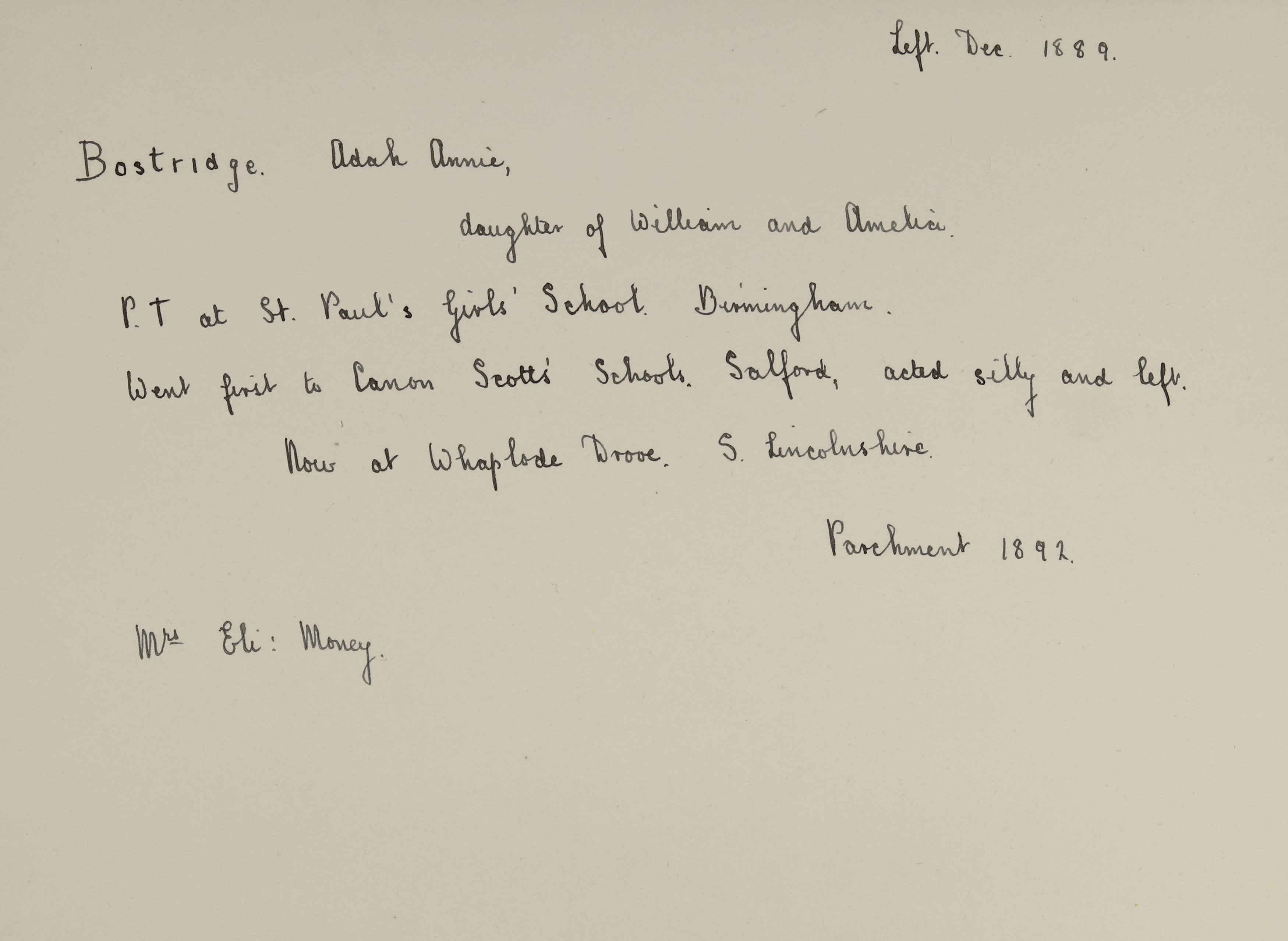 She is at The Village, Whaplode, Holbeach as a boarder. Robert Hollis (b. 1827) is listed as ‘Clerk in Holy Orders’. John J Needham (b. 1848) is listed as a boarder and ‘Carpenter’. Elizabeth Needham (b. 1847) is listed as a boarder and ‘Housekeeper’. Rebecca Mabel Needham (b. 1883) is unlisted. Ada is listed as a boarder and ‘School Mistress’. There is a servant, Louisa Martha Earl (b. 1872).