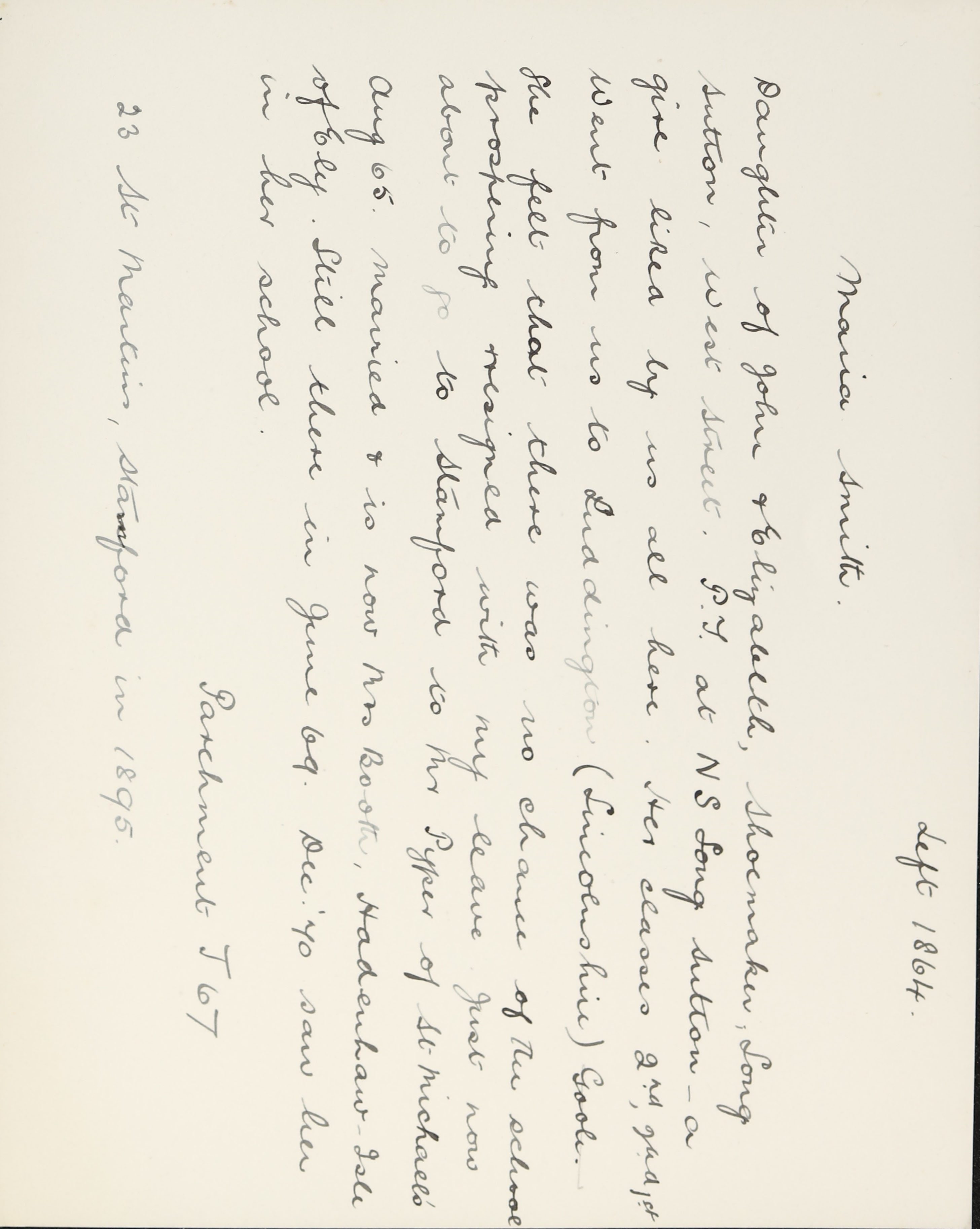 She is at High Street, St Martin, Stamford. Her husband is listed as ‘Manager of Water Works and Registrar of Deaths and Births’. Maria and Ethel Mary Knott (b. 1874) are unlisted. Her daughter, Helen, is listed as ‘Art Student Drawing’. Louise Ann Hamm (b. 1848) [LDTC 1867] is listed as ‘Certificated School Mistress’. There is a servant, Martha Croft (b. 1876).